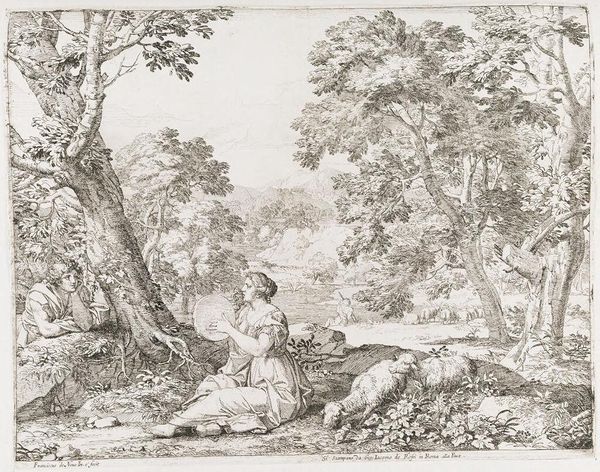 Editor: Frans de Neve’s etching, "Venus and Cupid," depicts a serene scene, almost dreamlike. The goddess seems lost in thought. What symbols do you see operating here? Curator: The symbols resonate deeply. Venus, of course, embodies love and beauty, but here, there's a contemplative stillness. Cupid, nearby, seems to be hiding his face, perhaps suggesting the potential for love to bring sorrow. The wooded landscape itself, almost obscuring them, speaks to love's complex relationship to nature and time. Editor: So, it’s not just about idealized love? Curator: No, it delves into love's psychological weight, acknowledging its bittersweet aspects. The symbols remind us that beauty is fleeting. It asks us to reflect on love’s transient nature. Did you notice this melancholic mood? Editor: I did, and now I see so much more. Thanks!