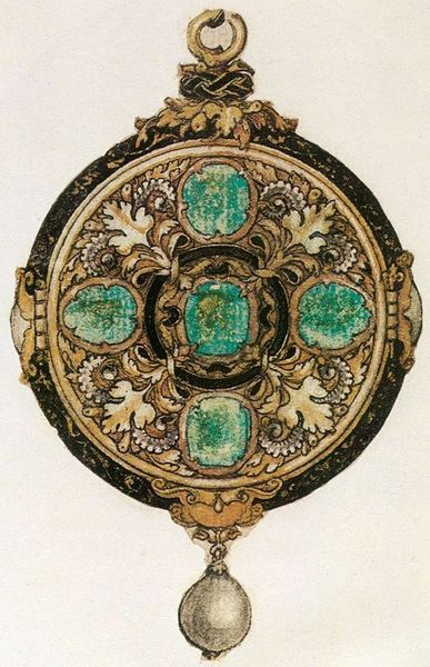 Albrecht Dürer's "The Imperial Crown," currently housed in Berlin’s Kupferstichkabinett, is a detailed drawing rendered in ink and watercolor. The composition presents a frontal view of the crown, emphasizing its elaborate ornamentation and symmetrical design. The interplay of shapes—circles, squares, ovals—creates a structured yet dynamic visual experience. Dürer's meticulous linework delineates the gemstones and figural panels that adorn the crown, contrasting with the softer, more organic forms of the crown's fabric lining. Each element contributes to a sense of hierarchical order, reflecting the symbolic weight of the crown. The design incorporates religious and historical motifs. The figures of biblical kings and inscriptions frame the crown’s structure, suggesting an intertwining of secular and divine authority. Dürer presents the crown as a complex object, loaded with cultural significance and embodying the fusion of art, power, and belief.
