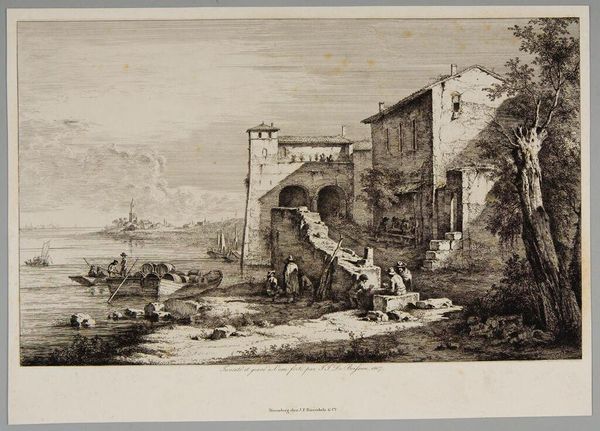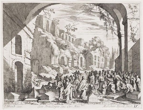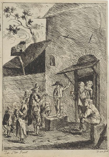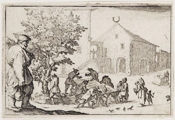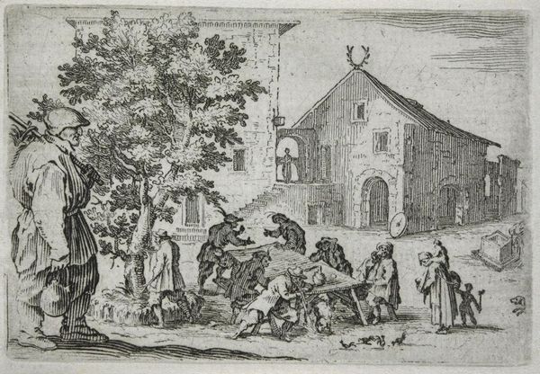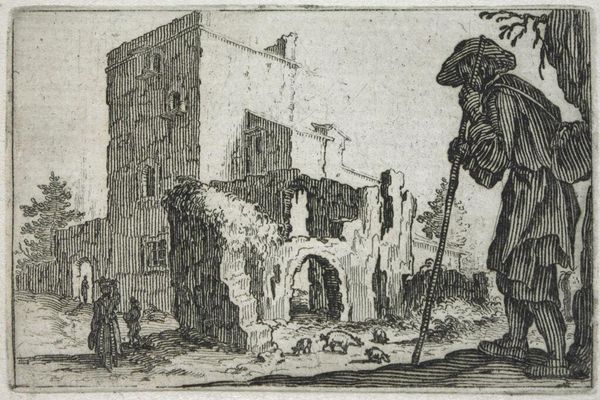 Editor: This etching, "Man Seated Before a Hospice" by Jacques Callot, really struck me with its depiction of hardship and resilience. The architectural details behind the figure pull me in. What cultural narratives do you think this image evokes? Curator: The hospice, the figures, and the seated man point to themes of charity, refuge, and perhaps even pilgrimage. The pointing gesture, a directional symbol, may suggest seeking help or guidance. What emotions does this evoke in you? Editor: A sense of hope amidst difficult times. It shows the enduring human spirit and the possibility of finding solace. Curator: Exactly. Callot's etching preserves a cultural memory of institutions providing sanctuary. This resonates across time, prompting reflection on how we care for each other. Editor: I hadn't considered the hospice itself as a central symbol. It’s amazing how much history can be contained in such a small print. Curator: Indeed, and each carefully rendered detail contributes to the narrative power, echoing through history.