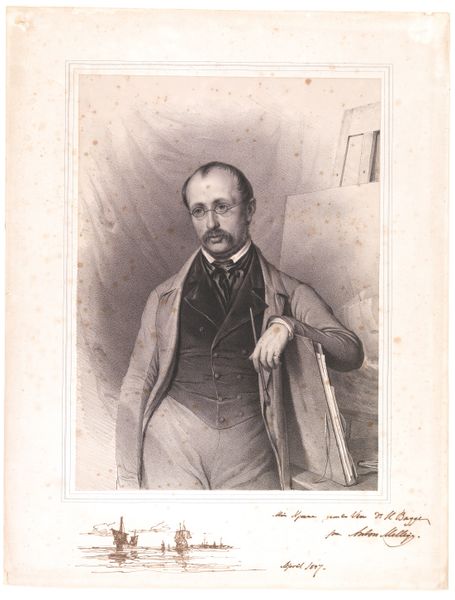 Curator: This is Achille Devéria's "Self-Portrait," a chine collé print housed here at the Harvard Art Museums. There's no specific date assigned, but Devéria lived from 1800 to 1857. Editor: He certainly has a striking gaze. There's a boldness here, a sense of direct confrontation with the viewer that is quite compelling. Curator: It's fascinating to consider Devéria's role in the Parisian art scene. He was well-connected, running a popular salon where artists, writers, and intellectuals gathered. How might his social position shape the reception of this self-image? Editor: Absolutely. In the context of early 19th-century Parisian society, this self-portrait might read as a statement of artistic and perhaps even social authority. The confident pose, the focused stare—it all speaks to a certain level of privilege and power. Curator: I appreciate how you've situated this portrait within its socio-historical context. It deepens our understanding of both the artist and the era. Editor: And for me, looking at this work has revealed layers of meaning that resonate across time, reminding us of the complex interplay between identity, representation, and social power.