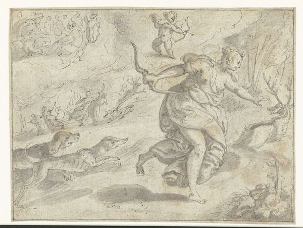 Editor: This is "Jupiter verbant Cupido uit de hemel," or "Jupiter banishing Cupid from Heaven," a pen, pencil, and ink drawing from around 1575-1580 by Jan Snellinck, here at the Rijksmuseum. I'm struck by the dynamism – there’s so much movement and energy conveyed through the lines. What do you see in this work? Curator: It's a compelling piece, isn’t it? Beyond the dynamism, I see a powerful assertion of patriarchal authority and the suppression of alternative forms of love and desire. Think about Jupiter, the ultimate patriarchal figure, literally banishing Cupid, a symbol of disruptive, often uncontrollable desire, especially same-sex desire which was often condemned during the Renaissance. Editor: Interesting. So, you're saying this isn't just a mythological scene, but a statement about power? Curator: Precisely. Mannerism, the style Snellinck employs, often utilized allegory to address contemporary social and political issues. Jupiter’s act of banishment can be seen as representative of the era’s attempts to control and punish those who challenged societal norms around gender and sexuality. Who gets a place at the heavenly table, and who gets thrown out? And how does that connect with Snellinck’s own social location and context? Editor: I never thought of it that way. I was focused on the aesthetics and the mythological story, but now I see the layers of social commentary embedded within. Curator: Exactly! By examining the artwork through an intersectional lens – considering gender, power, and historical context – we reveal a deeper, often uncomfortable, truth about the values and biases of the past. It provokes questions about who is allowed to express love freely and who faces societal reprisal. Editor: It completely reframes the artwork. I see it not just as a drawing, but as a document reflecting power structures and societal anxieties. Curator: And that’s the power of engaging with art history through contemporary theory. It transforms our understanding and compels us to ask critical questions about the world we inhabit today. Editor: Thank you. I’ve learned so much. I’ll definitely approach similar artworks with a more critical and questioning eye in the future.