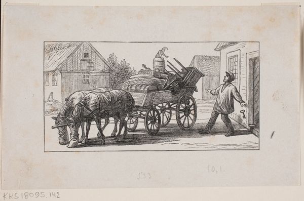 Editor: Here we have "Paard en wagen met iemand erin," or "Horse and cart with someone in it," a pencil drawing by Pieter de Josselin de Jong, dating between 1871 and 1906. There's something quite melancholic about the scene. The drawing style itself feels quite raw, focused on capturing the simple act of conveyance. What can you tell me about this piece? Curator: Looking at this drawing, I see a powerful document of labor. The roughness of the pencil strokes mirrors the physical exertion implied. Consider the materials: a simple pencil on paper, readily available and relatively inexpensive. This suggests accessibility, both for the artist and, potentially, the subject. Editor: That's interesting. So you're suggesting the choice of material speaks to a certain social class or experience? Curator: Precisely. Think about the socio-economic context of the late 19th century. The industrial revolution was reshaping society, and agricultural labor was still a dominant force. How does the starkness of the drawing style, and the apparent lack of idealization, contrast with academic painting of the same era? Editor: I see what you mean. There's no attempt to romanticize rural life here, or to paint it in a pretty way, unlike some other landscapes from this period. Curator: Exactly! It's a work focused on the fundamentals of the physical and social world, represented through humble materials. It invites us to think about the processes of its making and the context of its production. It shows art creation not separate, but an act of common making, like the labour in the image. What might someone buying, selling, or simply looking at this image experience? Editor: I hadn't considered the material choices that deeply before. Thinking about the pencil itself as a tool, connecting it to the horse and cart as tools also changes the meaning of the art to me. Curator: And there you have it: art deeply woven in society through labor and the materials of both the maker and what's being made.