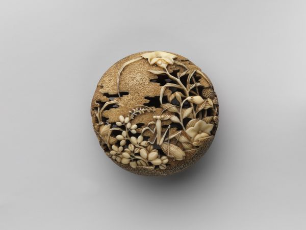 Editor: We’re looking at a Nazca flute or small container from around 180 to 500 CE, crafted from ceramic. I'm immediately struck by the contrast between the smooth, almost pebble-like form and the sharp, linear abstract motifs painted on its surface. It's a small object, yet there's something quite powerful in its simplicity. How would you interpret this work? Curator: From a formalist perspective, the interest lies primarily in the arrangement of visual elements and their material instantiation. Note how the painted motifs articulate the vessel's curvature. Are they merely decorative, or do they offer a kind of spatial counterpoint? Consider also the materiality; the ceramic is humble, yet it bears an elaborate design. What structural relationships do you see here? Editor: I notice that the painted elements appear to radiate from the center and edge of the vessel. They are not evenly distributed but seem to cluster, creating a sense of movement. Curator: Precisely. Furthermore, consider the line quality: notice the variation of line thickness in the abstract design. Does this subtle characteristic add depth or disrupt any possible meaning-making? What principles of semiotics might be applicable in approaching these visual devices? Editor: I had not considered the subtleties within what appeared like simple ornamentation. I guess what seems straightforward might demand more intricate viewing habits? Curator: Indeed. By focusing on elements like form, composition, and line quality, a new avenue for analysis can become visible. What started as a simple container gains newfound dynamism and sophistication. Editor: Absolutely. I'm left wondering about the function of these patterns, how they might engage us as we attempt to unlock their underlying framework. Curator: That’s a keen observation and perfectly elucidates our exchange here: an attention to structure illuminates novel perspectives of even the simplest form.