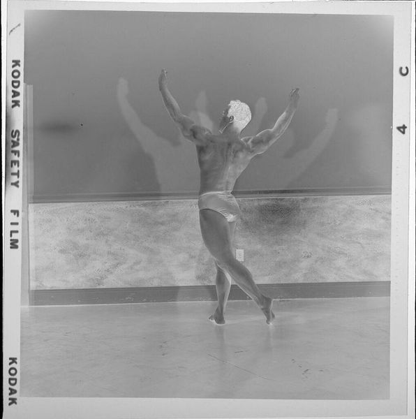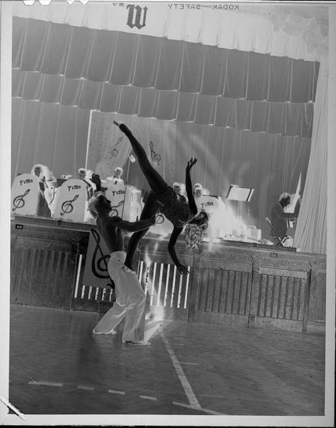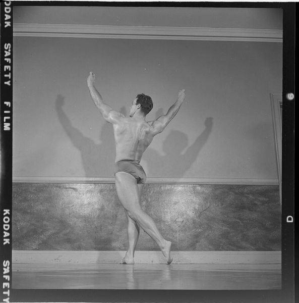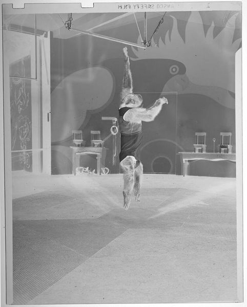 Editor: This is Peter James Studio’s “Untitled (female performer on stage),” a black and white photograph. It's quite small, almost like a snapshot. The contrast is striking. What can we learn from examining this photograph's materiality? Curator: The photographic process itself is crucial. Consider the chemicals, the paper, the darkroom labor. The artist's choice of Kodak safety film, subtly referenced at the bottom, speaks to the democratization of image making, but also the economic realities of the photography industry. It is important to consider who had access to these materials and what type of labor was involved in the artistic processes. Editor: That’s interesting, I hadn’t thought about the materials in that way before. Curator: Thinking about material processes can completely reshape how we perceive art history.