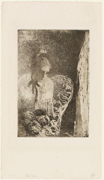 Editor: This is "Figurehead" by Chaim Koppelman, an etching. I am struck by its rather ambiguous shapes and the contrast of textures. What do you see in this piece? Curator: This image resonates deeply within socio-political discourse. Consider the title, "Figurehead." Traditionally, a figurehead is a symbolic leader, often lacking real power. Koppelman's abstraction, devoid of distinct features, prompts questions about the nature of representation itself. In what ways do you think it challenges notions of authority or identity? Editor: I guess I see how it questions traditional portraiture and what it means to portray a person or leader, as someone without inherent features. The lines seem rough, almost distressed. Curator: Precisely. The distressed lines speak to a history of erasure or perhaps imposed identity. Koppelman's background in social activism deeply informs his art. Knowing this, how might this "Figurehead" relate to marginalized identities and voices suppressed by dominant narratives? Editor: So, it could be about questioning power structures? A deconstruction of who gets to be seen and how they are portrayed? Curator: Exactly. The figure becomes a site of struggle, questioning the very idea of a fixed identity. Considering feminist theory, we might also examine how the fragmented form disrupts traditional gender roles and patriarchal expectations within leadership. Editor: This makes me consider the idea of constructed identity as a political act, stripping down the symbolism. Curator: Right. Reflecting on the power dynamics inherent in representation can lead to a deeper understanding of social justice. Art acts not just as aesthetic form, but rather as a powerful agent for dialogue. Editor: That is fascinating and offers me new lenses through which to view art’s ability to inspire such important reflections. Curator: Agreed!