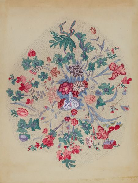 Editor: So, this is "Bandbox Design (Eagle and Rabbit)" from around 1936, done with watercolor and other paints. It's... unusual. The colors are so vivid and the scene itself is quite striking. The eagle feels both powerful and strangely whimsical. What catches your eye about this piece? Curator: Well, it's easy to get caught up in the "folksy" narrative, but let's look at the material realities. It's a design, likely for mass production. The careful watercoloring, the repetitive motifs… all speak to an industrialized process aiming for a specific market. Consider bandboxes themselves – humble objects of everyday use, often adorned with scenes like this to enhance their appeal and marketability. Do you think the artist intended any tension between the noble eagle and its mass-produced application? Editor: That's a perspective I hadn't considered! It does feel like a contrast - this national symbol reproduced for purely consumer purposes. Does the medium play a role in how the imagery functions as an identifier, then? Curator: Absolutely. The cheap and fast reproduction using watercolors, a medium readily accessible, democratizes the symbol. It detaches the eagle from any elite, painterly tradition and places it firmly in the realm of mass culture and everyday consumerism. The image itself becomes a commodity. What does that commodification do to the eagle's symbolic power, do you think? Editor: It sort of...cheapens it? Making it commonplace normalizes what was once elevated. It's really fascinating to think about art like this, in terms of production and consumption, not just aesthetics or symbolic meaning. Thanks for widening my perspective! Curator: My pleasure. By examining the artwork's materiality and its position in the marketplace, we gain a much richer understanding of its cultural function and meaning. It’s about seeing the social context embedded in the very materials of its making.