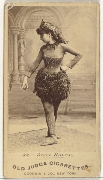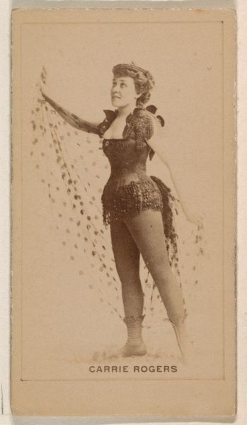 Editor: This is "Maud Waldemere, from the Actors and Actresses series," a piece dating from between 1885 and 1891, created by Allen & Ginter as a promotional item for Virginia Brights Cigarettes. It seems to be a combination of photography and print work. What strikes me immediately is the dramatic, almost theatrical, quality of her pose and attire. What do you see in this piece? Curator: I see a careful study in contrasts. The soft, almost ethereal background clashes deliberately with the sharply defined figure of Waldemere. The artist juxtaposes curves of the figure with the rigidity of the sword and walking stick. Editor: That’s interesting! So you’re saying the power of the image lies in these opposing elements? Curator: Precisely. Note also how the composition utilizes both light and shadow, highlighting specific elements to command the viewer's gaze, specifically the figure’s silhouette. Consider how her outfit plays with texture through contrasting shimmers from a tight-fitting suit over darker hose and buttoned boots, further emphasized through linear elements like tassels. Editor: I never noticed how much the texture played a part in drawing my attention. Thank you, that gives me a whole new appreciation for how to look at this! Curator: Indeed. Examining the interplay of line, form, and texture reveals deeper meanings than immediately apparent. I am struck by the artificial construction in relation to the image, as opposed to cultural and historic context. Editor: I am beginning to consider this as an artwork beyond the limitations of its original role. Thank you for providing clarity with alternative insights!