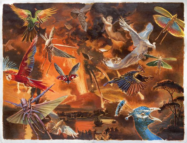 Curator: Arsen Savadov’s “Vesuvio 3000” from 2017 presents us with a riot of forms and vibrant color. What strikes you immediately about this mixed-media painting? Editor: Overwhelming! There’s an intensity—a cacophony even. The orange and brown palette feels apocalyptic, while these hovering figures—bugs, birds, babies—are uncanny in their placement. Curator: Indeed. Note the arrangement. Savadov uses the sky as a plane for meticulously rendered birds, cherubs, and insects. See how they create compositional tension—these diverse elements forming an almost allegorical panorama. The lack of clear spatial relations makes this an intricate formal exercise. Editor: An allegory of what, though? Considering Savadov's Ukranian background, and this chaotic explosion of forms, the title resonates with ecological disaster, maybe even societal collapse. The child riding a peacock…it’s a bizarre power dynamic that hints at disrupted futures. Curator: An interesting perspective, focusing on socio-political themes. One might also analyze the visual relationships between figures and the deployment of symbolism to reveal structural meaning—a cage for instance, floating against the potential of flight, or flight denied. Editor: And consider *whose* freedom is at stake. Who gets to fly, and who remains caged? Aren't the cherubic figures indicative of historical and contemporary exploitation of children and their future being put at risk? It's about power, who has it, and how it's exerted in such an ecologic situation. Curator: These are very distinct, though not mutually exclusive interpretations, don’t you think? Through visual analysis and historical insight, we begin to peel away layers of meaning, thus revealing structure and providing broader significance of the work. Editor: Exactly, situating it within larger discourses about climate change and social inequity opens new perspectives and possibilities when interpreting an artist’s work. "Vesuvio 3000" invites this kind of investigation, provoking critical discussion.
