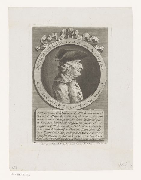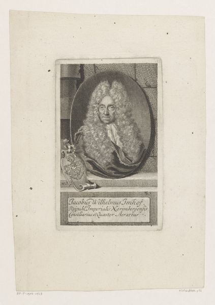 Editor: This is a portrait of Louis-René de Caradeuc de la Chalotais, a print created sometime between 1754 and 1809 by François Hubert. The stark black and white creates a very formal and almost austere feeling. How might we interpret the symbolism within this print? Curator: The visual language speaks volumes, doesn't it? Look at how he's framed within that oval wreath – almost a classical laurel, suggestive of accomplishment and honor. But it's not just the laurel, is it? We see an open book juxtaposed with a cherubic figure holding a coat of arms. What stories do they whisper? Editor: Well, the book feels like it signifies his intellect, perhaps his legal expertise. The cherub…maybe nobility or divine favor? Curator: Precisely. Think about the era – the Enlightenment, the rise of legal professions. This portrait is not just an image of a man but an embodiment of civic virtue and societal role. That book isn't just about knowledge, it's about the power of law, juxtaposed with hereditary privilege in the form of the coat-of-arms, raising questions, perhaps even subtly critiquing the established social order. Do you notice the contrast? Editor: Now that you mention it, the placement seems very intentional! I hadn't considered the potential social commentary. Curator: Images rarely offer just one surface. They act as mirrors reflecting cultural values and anxieties of their time, even if subtly, through the placement of culturally agreed upon symbols. What seemed straightforward becomes quite complex upon closer inspection. Editor: I learned that even what seems to be a formal portrait can have layers of hidden cultural meaning. Curator: Indeed, and in deciphering those symbols, we connect with the past and perhaps better understand our present.