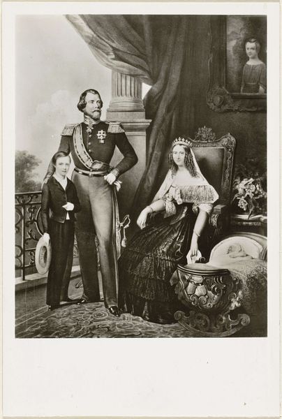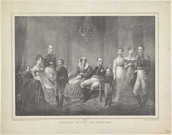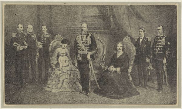 Editor: Here we have what appears to be a reproduction of a royal family portrait, titled 'Familieportret van Willem III, koning der Nederlanden, Sophie van Württemberg, zijn broer, zijn oom, zijn nicht met echtgenoot, en twee zoons', dating from 1874. It's an engraving, so a print. It strikes me as very formal and somewhat somber. What are some of the stories hidden within this carefully constructed image? Curator: Indeed, these group portraits served as potent symbols. Observe the rigid posture, the carefully chosen attire – each element speaks volumes about power, lineage, and societal expectations. It’s interesting to see the inclusion of extended family; what do you make of that choice? Editor: It emphasizes dynasty, I suppose, continuity. But also, maybe that the nuclear family wasn't enough on its own to project that power. Curator: Precisely! Consider, too, the symbolism inherent in their clothing. The heavy military garb of the men contrasts sharply with the elaborate, yet constricting, dresses of the women. These weren't just clothes; they were statements. Editor: So, the women are almost ornamental? Curator: They embody a particular brand of femininity – demure, supportive, maternal – integral to solidifying the image of the royal house. It’s a performance, a very carefully managed display of self. Do you think that sense of 'performance' changed over time with photography, making painted images seem more authentic in comparison? Editor: That's a great question, and I never thought of it that way. Thanks for your insight! Curator: My pleasure. It is amazing how symbols are powerful even today!