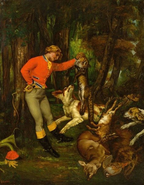 Editor: So, here we have Georg Karl Urlaub's "Portrait of Friedrich Adolph Carl von Holzhausen" from 1789, painted in oil on canvas. I find it kind of melancholic, almost staged in its formality. What strikes you most about this piece? Curator: Well, first off, look at the social dynamics embedded in this image. This isn’t just a portrait; it's a declaration of class and lineage. In late 18th-century society, who got their portrait painted and *why*? Think about the power structures being reinforced here. Editor: That’s true, it definitely feels like a status symbol. What about the setting? The landscape almost seems to swallow him up. Curator: Exactly. Is the child at ease in this nature? Or is nature itself another prop, highlighting man’s dominion? And consider the boy’s attire – the finery juxtaposed with a somewhat untamed environment. There is this clear message, almost like indoctrination of youth into a particular lifestyle that will benefit some more than others. Who benefits from all that art? Editor: I see what you mean. It's like he is both part of and separate from the natural world, a representation of cultivated aristocracy in contrast with nature’s wildness. Is the dog important, symbolically? Curator: Absolutely. Loyalty, status, and the hunt were closely tied to aristocratic identity. This animal isn't merely a pet, but a signifier. Can you start seeing how a portrait like this upholds an entire social and political order? Editor: Yeah, now I’m seeing how it reflects and reinforces specific power dynamics, and that everything from the clothes, the landscape, the dog, speaks volumes about wealth and privilege at the time. Thank you for expanding my understanding of art. Curator: My pleasure. Art isn’t just pretty pictures. It's a dialogue about who we are and who gets to be seen and understood.