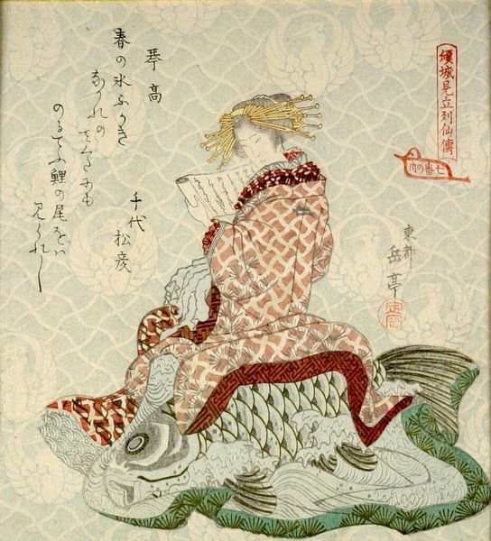 Curator: This woodblock print, entitled "Woman Holding a Kite with the Character 'Dragon'," comes to us from the hand of Katsushika Taito II. It's a compact piece, just over 8 by 7 inches. Editor: The colors! Muted yet vibrant. And that kite—it feels like a coded message floating just out of reach. Curator: Woodblock prints like this were often commercial products, tapping into popular culture. The materials—the paper, the pigments—were relatively inexpensive, allowing for wide distribution and consumption. Editor: It also feels incredibly intimate. The woman's posture, the way she clutches the kite...there's a story there, even if we can't quite decipher it. Curator: Perhaps the kite is a symbol of aspiration, or a commentary on the social constraints placed upon women. Considering the labor involved, it's impressive. Editor: Right, it makes you think about the artist's hands and the culture that inspired him. It's more than just a pretty picture. Curator: Indeed, a testament to the intersection of art, commerce, and social life. Editor: A small, captivating window into another world.