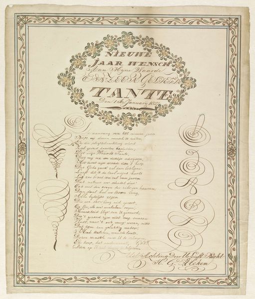 Curator: This delicate artwork is titled "Frame of Hair Flowers." It's a watercolor and drawing on paper, believed to have been made around 1938 by Clyde L. Cheney. Editor: Wow. It’s so intricate. There's something hauntingly beautiful about it. Almost like a pressed flower arrangement preserved, but on paper. The reds and yellows are intense against all that ornate darkness around the central image. Curator: Exactly! Hair flowers were popular during the Victorian era as tokens of remembrance or mourning, crafted from the hair of loved ones, living or deceased. The hair symbolizes memory, attachment, even a physical piece of the person. Editor: Right, like holding onto something tangible, beyond just memories. I feel the Victorians, and those inspired by them, were really tapped into the weird poignancy of keepsakes, things that remind us of fleeting moments or departed folks. This piece, with its faded elegance, really emphasizes that fragility. I feel as though each piece represents somebody's loss or somebody’s legacy and that we could explore those meanings deeply if we looked into its history further. Curator: There is also the writing within the border that feels like an intimate inscription from a love letter. The choice to frame the verses is interesting – giving permanence to words meant to be kept, close and considered often. The symbols carry many layers. We could study the text to extract more symbolism for some time, I suspect. Editor: It almost looks like it was designed to go into a scrapbook or locket. A tangible piece of someone to hold close during travels or separation, do you agree? What resonates for me is that so much emotion is evoked on this miniature scale. Curator: It really condenses a world of feeling, doesn't it? It also makes you think about our changing relationships with mementos in the digital age. Editor: Precisely! A photograph or a status update—so instantaneous and ephemeral. There’s such a weight of intent, of slow, careful making embedded here that speaks so compellingly of devotion and connection. Curator: Indeed. "Frame of Hair Flowers" whispers of intimate histories carefully preserved, then faded, now open to a fresh reading of those complex histories and feelings. Editor: And a new lens through which to see our own ways of keeping those histories and our attachments close.