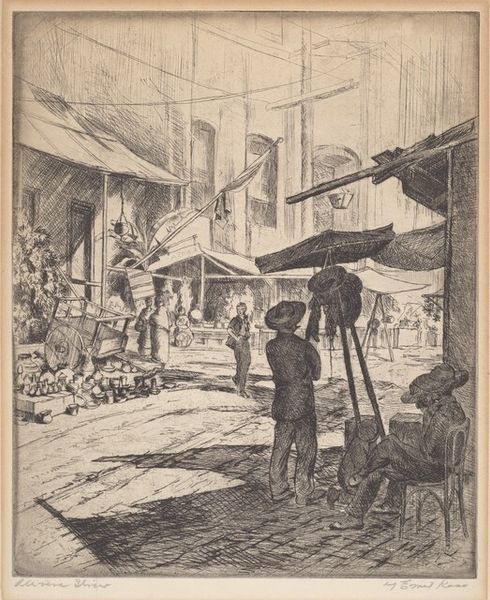 Curator: Let's examine Joseph Pennell's 1912 etching, "The End of the Day," currently held at the Minneapolis Institute of Art. The work predominantly employs ink on paper, showcasing a dense industrial cityscape. Editor: It immediately strikes me as bleak. There's a palpable sense of oppression evoked through the composition. The imposing verticality of the dock dwarfs the human figures. Curator: Notice how Pennell manipulates light and shadow. The stark contrasts, achieved through cross-hatching and varying line weights, create a dynamic visual texture. Consider, too, the composition; the vertical orientation emphasizing the depth of the dry dock against a turbulent sky. Editor: Indeed, and it's crucial to see this image as a commentary on labor, particularly in the early 20th century. These are not abstract forms; these are working-class bodies suspended precariously by a crane at day’s end. They are essentially commodities themselves, being moved. It speaks volumes about the dehumanization inherent in industrial capitalism. Curator: You introduce a valid point regarding the symbolism present. While the formal arrangement commands attention through its spatial rendering, we shouldn't ignore that Pennell was known to depict sites of tremendous construction— Panama Canal, for example, that showcase feats of engineering, in line with the style of the picturesque, and that also served propagandistic ends. Editor: I would press harder on the question of what is being propogated in this view; the cost to working-class bodies, extracted labor and danger. This piece evokes Millet’s “The Gleaners” but turned on its head, inverted, and imbued with dread rather than bucolic harmony. The "danger keep out" sign feels like the only sincere signifier of what to find here: precarity. Curator: I find your comparison thought-provoking. His strategic application of darkness creates visual tension that's key to comprehending its deeper content. Editor: Analyzing Pennell’s print offers a compelling intersection to analyze class struggle embedded within turn-of-the-century American art. Curator: A precise and fitting way to put this into a contemporary lens; I hadn't thought of the figures as such. Thanks!