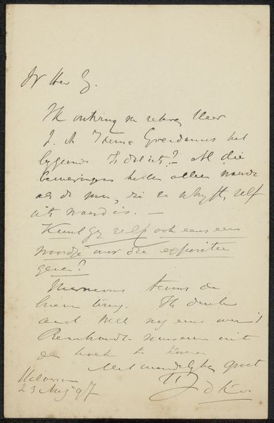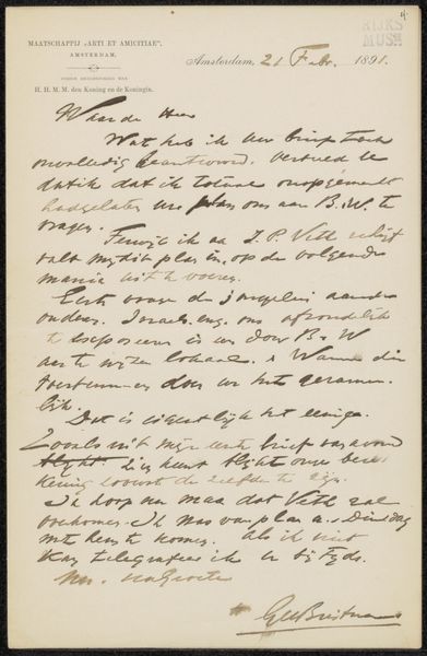 This is a page of "Aantekeningen uit archief Philip Zilcken", by Philip Zilcken. It is undated. At first glance, the page is filled with dense, flowing script. The ink, faded with age, creates a subtle contrast against the off-white paper. The overall texture hints at the physical act of writing. The composition reveals a complex interplay of lines, creating a visual rhythm that reflects the movement of thought. The handwriting, with its loops and curves, seems to suggest the mind at work, capturing fleeting ideas. The words themselves, though indecipherable without closer inspection, function as abstract forms contributing to the overall structure. The use of script challenges fixed meanings. Handwriting becomes a medium of personal expression, resisting the uniformity of printed text. The act of writing itself becomes a performance, capturing the writer's voice and the immediacy of thought. In this way, the artwork invites us to contemplate the act of communication itself and the relationship between language, thought, and the visual form.