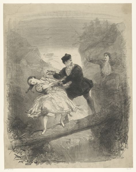 Curator: Ah, Daumier's "Couple Frightened by a Scarecrow," from 1845. A simple pencil drawing, yet it speaks volumes. What’s your initial take? Editor: It strikes me as humorous, yet a little unsettling. The couple seems genuinely scared of this… scarecrow. It makes me wonder what anxieties they project onto this figure in the field. How would you interpret this work? Curator: Good question. I see this drawing as a commentary on societal anxieties of the 19th century. Daumier was a master of social critique, and here, the scarecrow, a symbol of rural life, becomes an object of fear for a seemingly bourgeois couple. What does it say about their disconnect from the land, their fragile sense of security? Editor: So, it’s not just a funny scene, but also a commentary on class and urbanization? Curator: Precisely. Consider the power dynamics. The couple’s fear reveals a dependence, even a vulnerability, despite their apparent social standing. Daumier often used caricature to expose the hypocrisy and anxieties of the bourgeoisie. This is also published on a larger sheet featuring captions… “How silly we are to be afraid of such a thing… It’s only a horrible mannequin! I thought it was my husband!” These lines amplify a deeper social commentary. Does that shift how you view it at all? Editor: Definitely. I hadn’t considered the broader context of social critique and satire at play. The additional meaning behind that particular dialogue really ties the drawing together. Curator: It’s in those layers of context where Daumier's genius truly lies. Recognizing the historical backdrop transforms what initially appears as a simple sketch into a potent statement on societal unease and the human condition. Editor: I agree. I’ll definitely approach other seemingly straightforward artworks with a more critical eye, thinking about their context and intention, as well as intended audience.