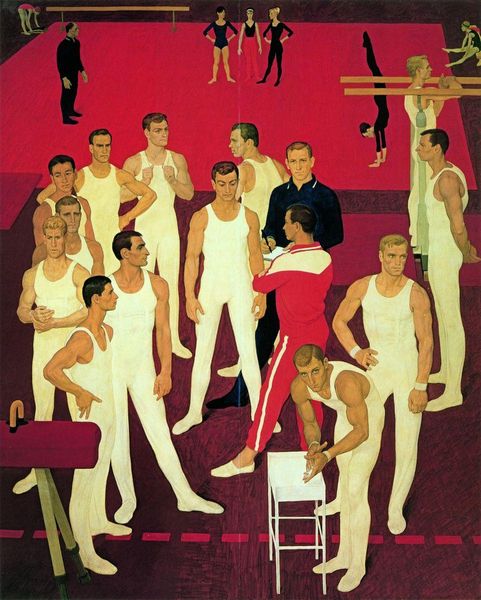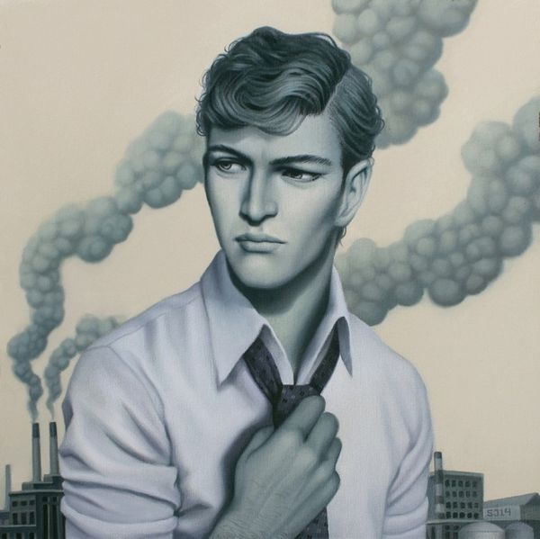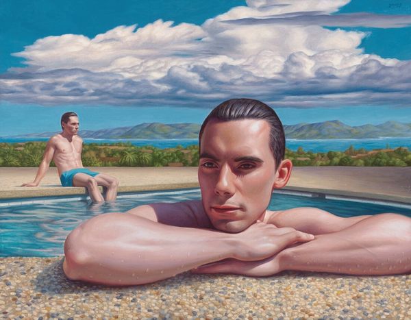 Curator: We're looking at Alex Gross's painting, "Envy". It's rendered with acrylic, combining realist painting techniques with elements of pop-surrealism and caricature. What's your initial impression? Editor: Intense. My gut says it's a really unsettling composition, like a warped 1950s advertisement campaign lurking in a twilight zone dimension. There’s a menacing, uncanny valley vibe radiating off of those figures. Curator: Gross often incorporates social commentary into his work. The title, coupled with the imagery of this clean cut, yet unsettling character, could speak to themes of consumerism and desire. This portrait brings to mind mid-century ideas of perfection contrasted with the reality of human flaws. Editor: Right? He's snacking on fries like there is nothing wrong with this picture, as a pale moray eel tongue darts into view and as the other dead-eyed character, oh I guess he's also pale as a moray eel, sneers like he has the fires of hell for eyeballs! I almost forgot, there's an atomic bomb exploding in the background... This is some anxiety inducing composition. Curator: Exactly. That sense of unease, is likely intentional. The combination of recognizable portraiture, but distorted through subtle stylization is reminiscent of other artists engaging with surrealism, and its influence on social narratives. The exploding cloud? Might symbolize existential dread, consumerist dissatisfaction, a generation on the precipice. Editor: Existential dread... right before you inhale some freedom fries! Maybe it's a commentary on the human tendency to crave what others possess, and this want leading to a sort of apocalyptic scenario—both personal and perhaps global. Also, the pastels feel really deliberate too; it gives the work this off-kilter and unsettling appearance... Almost sinister. Curator: Agreed. Gross plays with expectations. "Envy", isn’t simply about the surface level desire, but, could symbolize our collective desires, and the cost these yearnings may exact. Gross asks us to look at the masks we wear, and perhaps more pointedly, examine what simmers underneath. Editor: It really makes you think. After sitting with it a bit, what screams the loudest, for me, is the hollowness of it all. Those two suits and those fries; maybe it's just that everyone in the piece already got everything they thought they ever wanted? What a hell. Curator: That’s a perfect summary, an image as a commentary, prompting the viewer to reflect on our societal mirrors.