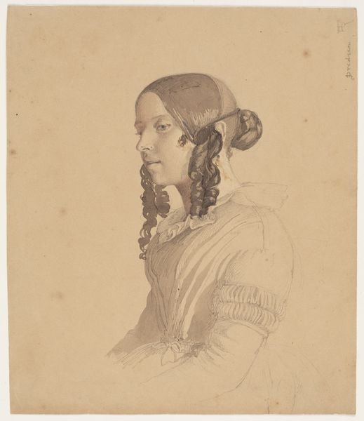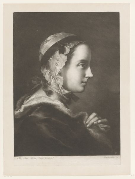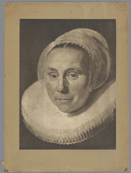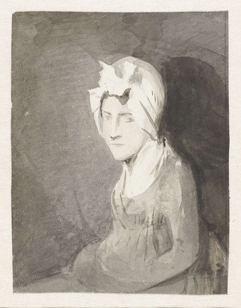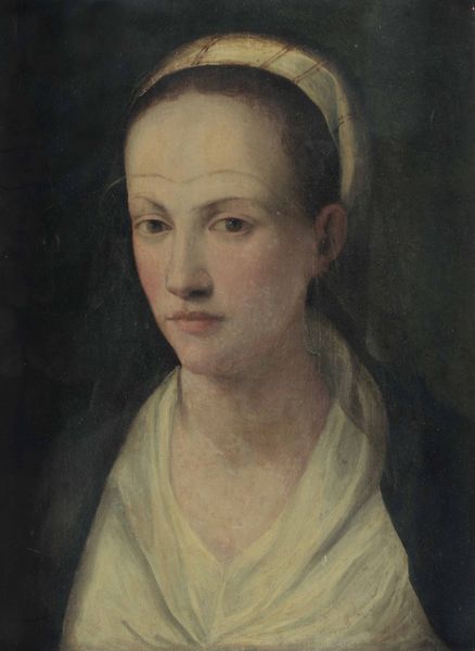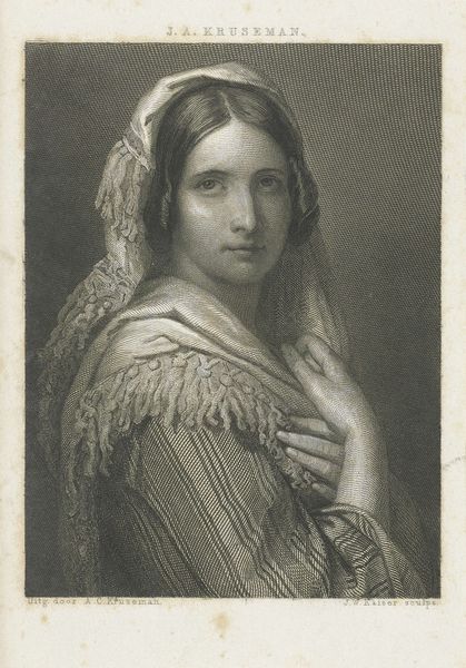 Curator: Let's take a moment to appreciate this intimate portrait by Johan Thomas Lundbye, dating from 1836. The title informs us that it is of “Oberstinde Cathrine Lundbye, f. Bonnevie, kunstnerens moder,” the artist’s mother. It’s oil on canvas and resides here at the SMK, Statens Museum for Kunst. Editor: Immediately, I am struck by the gentle somberness. The muted palette, the soft light on her face…she seems so contained, thoughtful. And that frilly bonnet—almost aggressively proper! What secrets is she keeping? Curator: Bonnets like that weren't really about secrets. Think of them more as badges. Each fold, each ribbon held a symbolic weight – social standing, marital status, perhaps even religious affiliation. This portrait encapsulates much more than the individual. It whispers of 19th-century Danish bourgeois values. There's a powerful, encoded language here. Editor: Right, I see that, too, the social coding of the clothes. Still, there's a flicker of… something, behind her eyes. Almost resignation, maybe, a hint of longing. The cool blues in her scarf and bonnet juxtapose wonderfully with the reddish browns of her coat – a play of control against something warmer, maybe, but suppressed. Or perhaps, my projection overwhelms historical reading here? Curator: Possibly. What strikes me most is the power of visual memory it evokes. Lundbye painted his mother here, ensuring she wouldn't be forgotten, or at least allowing her image to represent more. Editor: Isn't it interesting that her gaze is fixed off to the side? We're given a profile, which always feels somehow more distanced, less directly communicative, leaving room for interpretation. Curator: I concur, it makes the viewers think deeper as the direct access is impossible here. The composition directs the focus to decoding cultural codes, thus her direct gaze towards viewers could be considered somewhat redundant here. Editor: Right, in a way it shields her. But it makes me wonder what she's looking at… what she sees that we can't. Thanks, that was insightful! Curator: A very rewarding reflection; thank you for offering your unique perspective!