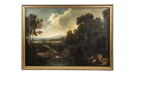 Editor: So, we're looking at "Diana and Actaeon," an oil painting, and the artist is Claude Lorrain. Immediately, the light just pulls me in – it's so warm and golden. The scene itself feels peaceful, but there's also something dramatic happening with the figures... How do you interpret this work? Curator: For me, this painting operates on a few symbolic levels. Consider how water, a recurring motif in Lorrain's work, serves as a space for both purification and vulnerability. In this image, it highlights the sacred space of Diana and her nymphs. Now, juxtapose that with Actaeon, the intruder – how does that disruption play with themes of transgression and fate, especially in relation to landscape as a container for collective memory? Editor: That’s a really interesting way of putting it. So, the landscape almost *holds* the weight of that cultural story? Curator: Precisely. It’s not merely a backdrop. Think about the positioning of the figures, Diana and Actaeon. How does Lorrain visually emphasize their respective roles within the ancient myth? The act of viewing itself becomes fraught with peril, doesn't it? Editor: Absolutely! The composition directs our eyes right to that moment of discovery, which then leads to Actaeon's transformation... It's like Lorrain is reminding us of the power of symbols to transcend time and hold complex ideas. Curator: Indeed. We see the influence of this idea echoed through history, which confirms that symbols provide meaning. What have you noticed exploring this piece? Editor: It made me think about how even seemingly idyllic landscapes can be imbued with potent narratives and that the story is not just something that happened, but something remembered and re-enacted through art. Curator: Precisely. These stories and their visual representations shape how we perceive ourselves and the world around us.