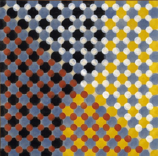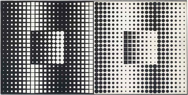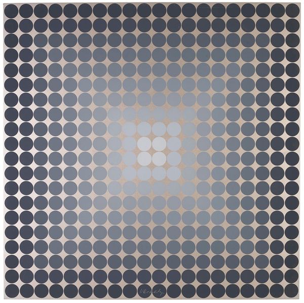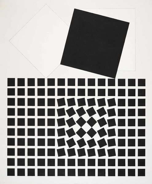 Curator: This is "Eridan-2" by Victor Vasarely, created between 1957 and 1963. A striking example of Op Art, wouldn’t you say? Editor: Absolutely. It’s dizzying, immediately activating the eye. The black and white contrast and grid structure create this push-and-pull effect, almost like an optical illusion. Very compelling use of basic forms. Curator: Indeed. And consider that Vasarely, steeped in the modernist principles of the time, sought to create art accessible to everyone, blurring the lines between high art and design through these repeated geometric forms. Editor: And it speaks volumes about accessible design. He is working directly with the materiality, labor, and production – questioning artistic expression, focusing on process, the actual doing of art and democratizing the creative output through simplified forms. It challenges traditional hierarchical boundaries. Curator: Exactly, it’s a radical gesture. His approach allows us to think about perception itself – the relationship between the artwork and the viewer becoming a critical element in its completion. Editor: The historical context is key too. Post-war optimism mixed with Cold War anxieties fueled experimentation and the quest for universality that speaks to shifting understandings of industrial and individual meaning-making during this period. Curator: I’d add that the stark contrast – the black and white – plays with positive and negative space, and invites the viewer to grapple with binaries, tensions inherent in both abstract and representational artistic approaches and society in the era in general. Editor: Right. This period, it's about stripping down and looking for core values – something evident in all the arts. Curator: So "Eridan-2," though seemingly simple, represents a rich tapestry of social and artistic thought, prompting us to question the very nature of how we see, how we interact with material objects and artistic labor. Editor: Precisely. Vasarely used geometric patterns to address not only abstraction, but to encourage critical, social questions related to form, function, making, and material, especially in mass produced format that allowed art to enter public space, engage the viewer, and break down previous art viewing power dynamics. It still resonates powerfully today.