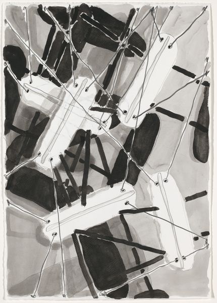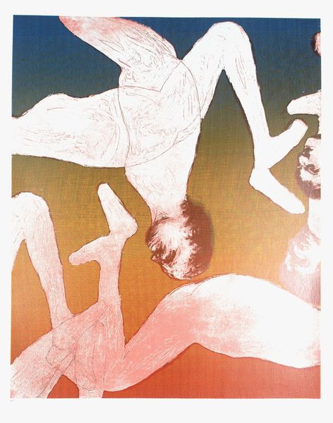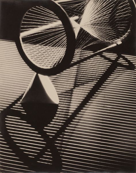 Curator: Here we have J. Richard's intriguing photograph, "Drie acrobaten," its date thought to be sometime between 1960 and 1964. What springs to mind for you looking at this, Editor? Editor: It strikes me as oddly weightless. These figures poised precariously on what I imagine is a high wire, bicycles and all, suspended against that flat, empty sky. It's all angles and tension. What do you make of it? Curator: It feels like a capture of a fleeting dream. The bicycles themselves appear fragile, almost ghostlike. But thinking of process and the act of photographic reproduction, look closely at the faded tones of gray, and those stark, nearly geometric black lines… This photograph documents not just the performance but the labor and the physical construction behind such feats. The balancing act is material. Editor: Good point! It’s almost brutal in its honesty; look at the exposed cables and lights hanging above, cutting through the clean sky. Those cyclists put their bodies through a punishing regime and depend on material constructs such as their clothing, shoes, bicycles, and wire… everything in service of that momentary performance for an audience that more than likely consumed this scene, and soon moved on to consume something else. Curator: Absolutely. There’s this raw, almost confrontational edge which makes the whole endeavor seem simultaneously magical and mundane, dangerous and strangely banal. One thinks, “That could be me up there”, riding that bicycle. Maybe we all are, in some symbolic fashion! Editor: Or rather, those performers ARE us; to imagine those risks. In a way the artist highlights these concerns, as a common subject, within reach; we can, ourselves, participate and share in the construction of this feat. Do you imagine that sense of accessibility was indeed the intended effect of the image? Curator: Perhaps; but the sheer bravery of the performance gives us license to imagine something more than simple, human ingenuity at work. A sense of overcoming human frailty; not quite a transcendence but something... else! Editor: Well, either way, I appreciate you taking me along to consider the production and consumption behind what at first felt so ethereal and fragile! Curator: And you, the invitation to come back down to earth! An everyday image filled with wonder.