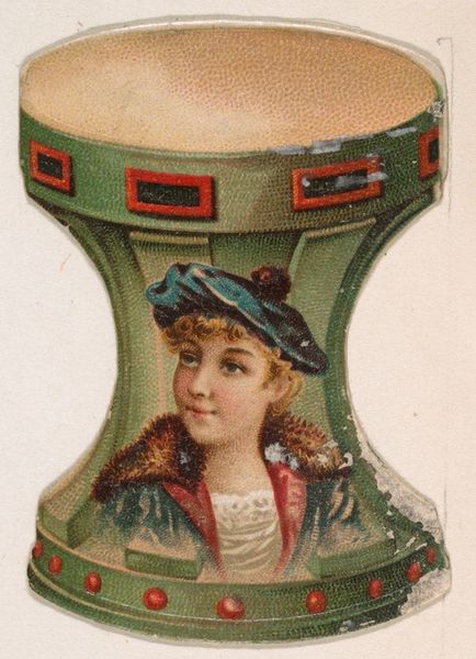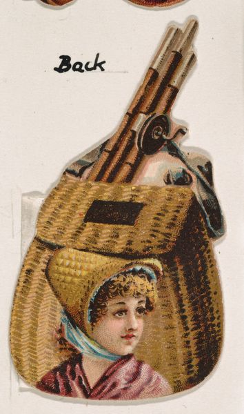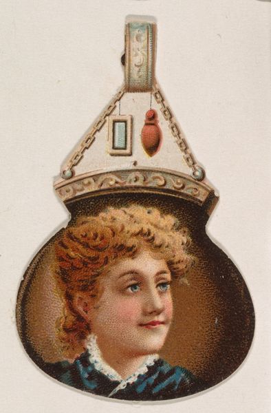 Curator: What a peculiar artifact. The lines are interesting. Editor: Indeed. This is "Beetle, from the Novelties series," created around 1889 by the Kinney Brothers Tobacco Company. It is currently housed here at the Met. Curator: A tobacco advertisement. The intersection of commerce and art is never simple. A somewhat unnerving synthesis, though I must admit, quite intriguing. It has an unconventional composition... a portrait of a woman nestled within what appears to be a beetle’s carapace. Editor: From a formal standpoint, the juxtaposition is quite jarring. We have a very conventional portrait set against this rather bizarre beetle shape, executed via collotype print, mimicking the ukiyo-e style. It is almost Dadaist in its play with form, wouldn't you agree? The colors too…the muted browns against the creamy skin tone, with that little pop of teal on the headband. Curator: These Novelties were often printed as series. To better understand its context, it's worth examining these advertisements as cultural artifacts: how did they influence societal perspectives? These cards acted almost as miniature billboards, entering everyday life and normalizing very particular kinds of imagery, with an ideal female type. Editor: Perhaps it represents more than simply tobacco. Think about the beetle: scarabs symbolize transformation and regeneration, especially within ancient Egyptian art. Might the placement of the woman's portrait suggest the dawn of the new modern woman? A woman, of course, enjoying fine tobacco. Curator: Intriguing... And a powerful testament to advertising’s role in shaping those transformations, no matter how subtly. The way these companies weaved these everyday associations is telling, and this tiny object holds within it an abundance of cultural insights. Editor: Exactly. A rather uncanny object from the Gilded Age, revealing a potent intersection of advertising and identity, cleverly encapsulated through composition and symbolism.