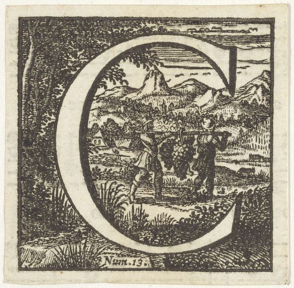 Editor: This is a 17th-century engraving, “Letter D in een omlijsting met een voorstelling van David die door Samuël tot koning wordt gezalfd,” made by an anonymous artist. It's interesting how a biblical scene is framed within this elaborate initial. How do you read this piece? Curator: This initial D encapsulates a moment of profound social and political transition. Consider the act of anointing itself: it's not just a religious ritual, but a public declaration of power sanctioned by a higher authority. It visually cements David's ascendance in a time rife with hierarchical structures. Editor: It's fascinating to see the anointing depicted within the letter itself, almost like the letter ‘D’ is crowning him too. What is the relationship between the architecture on the left and the natural setting on the right? Curator: That contrast is critical. The architecture can represent established power, Saul’s regime, while the landscape might be the untamed potential, the space where new leadership, like David’s, takes root. In looking at it more broadly, the small-scale scene invites considerations of identity: Who has access to visibility and power? Where does true authority reside, and who determines it? Editor: So the choice of scene is tied to broader questions about the legitimacy of power and social transformation at the time. I guess what I initially perceived as merely decorative carries potent sociopolitical meaning. Curator: Precisely! This work encapsulates so many aspects: religious justification, social dynamics, political positioning all condensed into this single letter. Approaching art with questions about gender, race, and access is the first step to broader understandings. Editor: Thank you! I'll certainly consider it a work brimming with political significance beyond the literal biblical depiction.