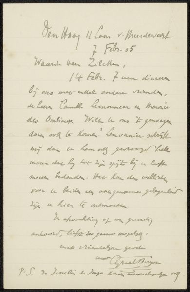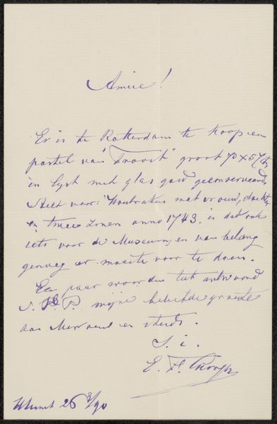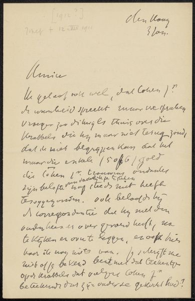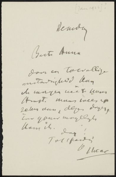 This letter was penned by Isaac Israels in 1925 with ink on paper. Look at the density of the looping lines. It's like a dark swarm resting on the pale surface. To me, this speaks to the intimacy of the written word, the quiet scratch of the nib dancing across the page, a kind of intimate performance between the writer and their thoughts. The letters huddle together, forming words that carry weight and meaning. The ink bleeds slightly into the paper, as if the words themselves are seeping into our consciousness. Notice how the density of the lines varies, creating a rhythm and flow that mimics the ebb and flow of conversation. It feels like you could trace the path of the pen with your finger, following the rise and fall of Israels' thoughts. This reminds me a little of Cy Twombly, but with a sense of purpose, a message to deliver. It's a good reminder that art is just one big conversation across time, each piece building on what came before, each artist adding their own voice to the chorus.