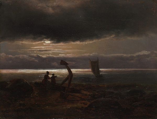 Knud Baade created this dramatic shipwreck scene on canvas, using oil paints. Baade’s skilled brushwork renders a captivating, moody atmosphere. The materiality of oil paint allows for a depth of color and texture, which enhances the romantic feel. Think about the labor involved in creating such a painting, from grinding the pigments to layering the glazes, and the economic structures that supported such artistic endeavors. The wreck itself speaks to the dangers of maritime trade, a crucial aspect of 19th-century capitalism. The painting acts as a potent reminder of the human cost often hidden behind grand narratives of progress and exploration. By focusing on material, making, and context, we can appreciate how "Shipwreck by Moonlight" transcends traditional distinctions between fine art and craft, offering a rich commentary on labor, politics, and consumption in its time.