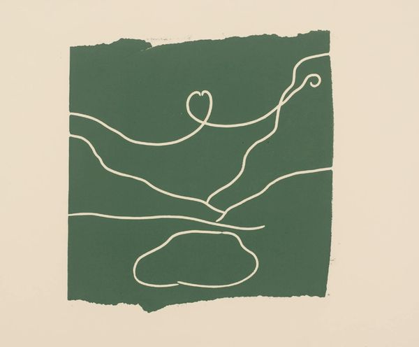 Curator: Barry Flanagan's "Llandudno" presents us with a rather intriguing composition. The minimalist lines over the verdant block give it an almost whimsical air. Editor: It feels very grounded despite the playful lines. The green resonates with environmental concerns and the political ecology surrounding land use. Curator: I see that. And the contour lines, they do seem to evoke a sense of boundaries, physical and perhaps even social? It makes me consider issues of access and ownership. Editor: Exactly! How does one claim or represent landscape? The simplification nods to larger struggles concerning the commons, cultural memory, and the natural world. Curator: I find myself returning to the materiality—the texture of the print itself. The flat color and the stark lines create such a compelling contrast. Editor: Indeed. It encapsulates both the personal and the collective relationship we have with these spaces. Curator: It certainly offers more than first meets the eye. Editor: Absolutely, a testament to the complexities embedded in seemingly simple forms.
