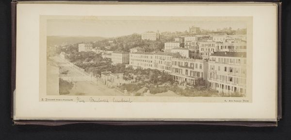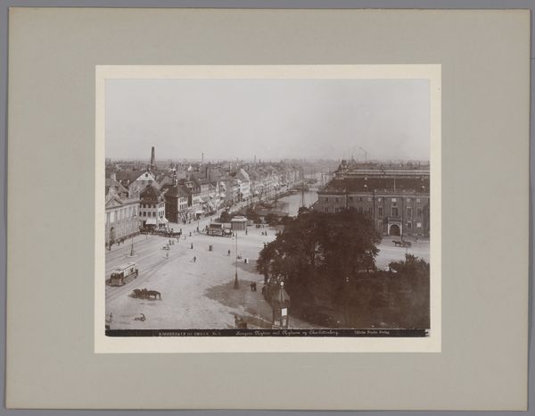Curator: This gelatin-silver print, titled "Gezicht op een station en het Koninklijk Paleis van Madrid," captures a view of a station and the Royal Palace of Madrid sometime between 1888 and 1898, and is attributed to Hauser y Menet. Editor: It has a quiet, formal beauty. The bare trees almost feel like an architectural feature, framing the station and palace. Curator: This piece speaks to the rapid modernization happening across Europe during this period. Railroads symbolized progress and connected disparate communities and cultures, as did grandiose public buildings, especially royal palaces. This photograph becomes an index to a society changing before its own eyes. Editor: Exactly. Railroads especially are powerfully evocative symbols, even now—conjuring journeys, meetings, arrivals and departures, with complex social underpinnings relating to global economics. The perspective chosen also flattens the space between these landmarks. Curator: The choice to use photography, rather than painting or etching, underscores the artist’s desire to document this specific historical moment with precision. Its style is aligned with Pictorialism, which granted photographers more expressive, artistic possibilities. Editor: Even in black and white, there’s a clear visual hierarchy here; the crisp architecture asserts dominion over nature and over individuals walking through. Are they also asserting a socio-economic dominance? Curator: It’s likely that Hauser y Menet, operating within commercial and societal contexts, intended to promote Madrid's image. By juxtaposing infrastructure with the monarchy, the artist offers a layered message about progress and established power structures in Madrid during that time. Editor: Very compelling! In the end, the image functions as a preserved fragment, an encapsulation of cultural change and collective memory viewed with both clarity and emotion. Curator: I agree; the photograph successfully captured both Madrid's ambition and grandeur during a fascinating period.