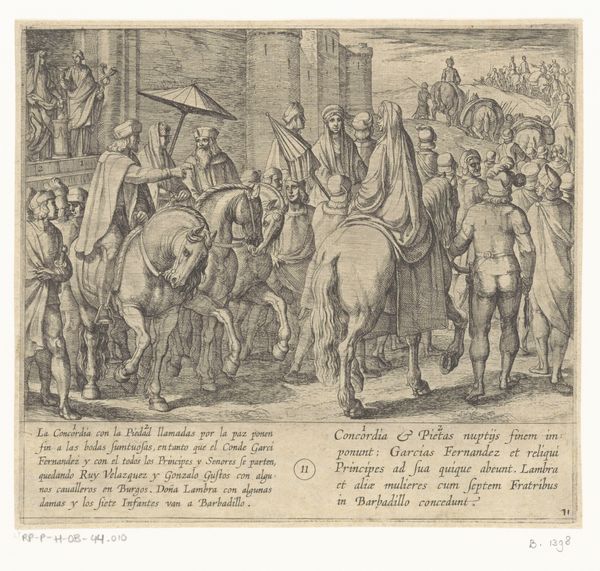 Antonio Tempesta created this print, "Gonzalo Gusto gives a ring that must be given to his unborn child if it is a son", sometime between 1555 and 1630. The image depicts a scene of negotiation and anticipation tied to dynastic succession. Made in the context of early modern Europe, the image engages with ideas about lineage, power, and the role of inheritance in shaping social structures. The visual codes of the print, such as the exchange of a ring, carry significant cultural weight, signifying promises and future obligations. This print offers insight into the social values placed on male heirs and the strategies employed to secure their futures within elite circles. It invites us to consider the politics of imagery and the social conditions that shape artistic production. To understand this print more deeply, one could research the history of family structures, gender roles, and inheritance laws in early modern Europe. By exploring such resources, we can gain a richer appreciation for the social and institutional context in which this artwork was created.