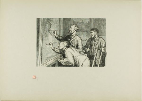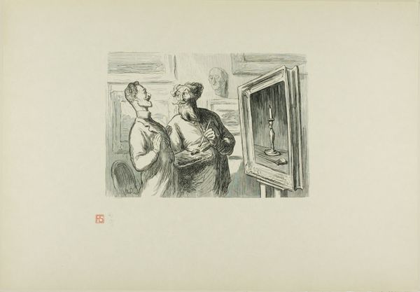 Editor: So, this is "Painter and the Bourgeois," potentially made between 1862 and 1920, by Charles Maurand. It's a print, an engraving on paper. It strikes me as a very pointed commentary, almost a caricature. What's your take on it? Curator: From a materialist perspective, it's interesting to consider the production of this print. Engraving, unlike painting, is inherently reproducible. This allows for wider dissemination of the image and its message. We need to consider what social and economic conditions made it possible. Was this image aimed at the rising bourgeois class? What was Maurand’s economic situation? Editor: That’s interesting, thinking about it being reproducible. I hadn’t considered that aspect and the implications of the artist creating something meant for wider distribution. The "caricature" tag makes me think the image aims to lampoon this emerging class; that the art critic isn’t the one truly making the work, he just consumes the finished product! Curator: Precisely. The medium itself – printmaking – enabled the critique of social class in ways a unique oil painting perhaps could not. It begs the question: who had access to prints at this time, and what did it mean to satirize wealth through a widely accessible, mechanically reproduced image? Do we see labor reflected back onto itself here? Editor: So, it becomes a tool in itself to critique, right? Like, the method is part of the message. The artwork’s statement could be weakened if it were presented as a painting, meant for private consumption of the rich... Curator: Exactly. It is crucial to look at how the method shapes meaning, impacting not just interpretation but reception as well. What better way to bring awareness of social and economic issues to the wider populous. Editor: Wow, this completely shifts how I view the work. I was focused on the content and the humorous style but I didn’t connect it with distribution method. Thank you. Curator: That’s the beauty of materialist perspectives, examining not just what an artwork represents, but *how* that representation is materialized.