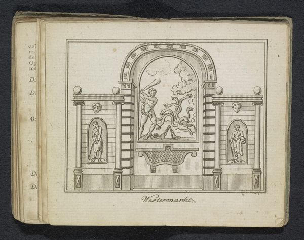 Curator: Isn't this a delightful find! We’re looking at a drawing from around 1640 to 1660, titled "Ontwerp voor tuingevel met portieken en een borstbeeld," which translates to "Design for a Garden Façade with Porticos and a Bust." It’s currently held in the Rijksmuseum. It's rendered in colored pencil, showcasing an architectural design, most likely for an exterior garden wall. What's your initial take? Editor: It gives me a feeling of subdued grandeur. There's a formality in the architectural elements, yet the colour palette is restrained, almost melancholic. The emptiness of the side niches hints at absences, don't you think? Curator: Absolutely! It is melancholic. It's as though the architecture itself is breathing a sigh. The artist, who remains anonymous to us, captured this transient state so well with colored pencil. Think of the Dutch Golden Age and these displays of wealth, culture, yet also hints of impermanence. Editor: Precisely. Garden façades such as this functioned as sites of display and performance. They are assertions of power but were always contingent on who was being displayed or, in this case, who the bust was. How do these types of representations support existing hierarchies or resist social ones? Curator: It's a good question! Perhaps that the bust is in the center symbolizes a yearning for immortality through representation? What better way than sculpture to immortalize a persona? Although the person represented in the bust remains nameless, there seems to be an air of confidence to this project. Editor: That said, I can't ignore those lion heads draped in swag. In art history, lions are potent symbols of sovereignty, dominion, and even justice. What narrative threads do you think this type of ornamental choice helps to reinforce at the time? What statement about class and cultural capital is implied through these very intentional aesthetic choices? Curator: Indeed! So it makes you wonder: would this kind of aesthetic, back then, signal power or oppression, considering how exclusionary it must have been to build walls like these? Food for thought as one imagines how society must have reacted at the time! Editor: Agreed. Ultimately, this sketch asks questions about public versus private, permanence versus decay, who is remembered and who is forgotten. Curator: So true. These façades stood, quite literally, at the threshold. Such reflections linger with you. Thank you for opening our eyes to the drawing's richness beyond its formal beauty.