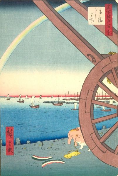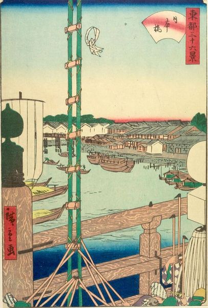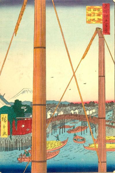Curator: This print, by Utagawa Hiroshige, is titled "Inari Bridge and Minato Shrine, Teppozu" from the series "One Hundred Famous Views of Edo." Editor: It's such an arresting composition! The towering bamboo poles create this incredible sense of depth, almost like looking through a screen. Curator: Hiroshige's genius lies in his ability to capture the spirit of Edo period life, the bustling waterways that were the lifeblood of the city. Editor: The Inari Bridge is a powerful symbol, representing not just a physical connection, but also the connection between the earthly realm and the divine, wouldn't you agree? Curator: Absolutely. The shrine itself, dedicated to the god of rice and prosperity, would have been a focal point of community life, both economically and spiritually. Editor: And Mount Fuji in the distance adds such a serene counterpoint to the busy foreground, doesn't it? A symbol of permanence amidst constant change. Curator: Seeing the way Hiroshige frames these familiar landmarks really allows one to reflect on Edo as it transitioned into the modern Tokyo we know today. Editor: The whole scene really invites you to contemplate the enduring power of symbols and how they shape our collective memory.