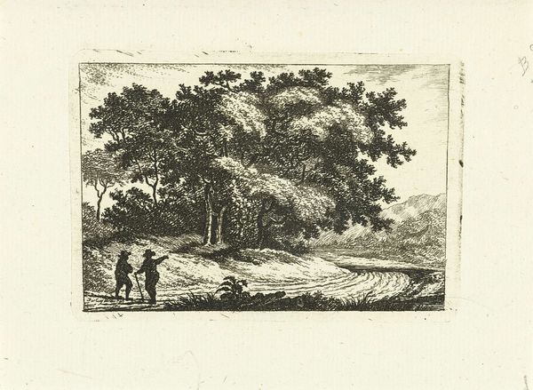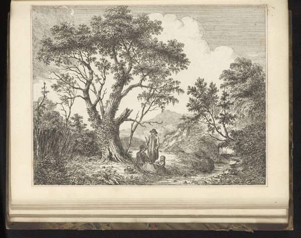 Curator: This is "Landscape with Man, Women and Children" by F. Torond, currently held at the Harvard Art Museums. Editor: It feels like a moment captured from a pastoral myth—a woman, children, and a working man within a classical idyll. Curator: The etching's sepia tones and delicate lines evoke a sense of nostalgia, reminiscent of classical landscape paintings that often symbolize simpler, agrarian times. Editor: But that simplicity is misleading. Who gets to perform leisure, and who must labor, often falls along gendered lines with complex social implications. Curator: Perhaps the artist intended to comment on these disparities. Landscape as a space of gendered division? Editor: Maybe, but it's hard to say. What is clear is how the image replicates certain ingrained cultural dynamics. Curator: A visual symbol that preserves more than meets the eye. Editor: Exactly, and one that makes you rethink those dynamics, even now.