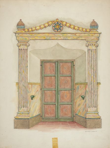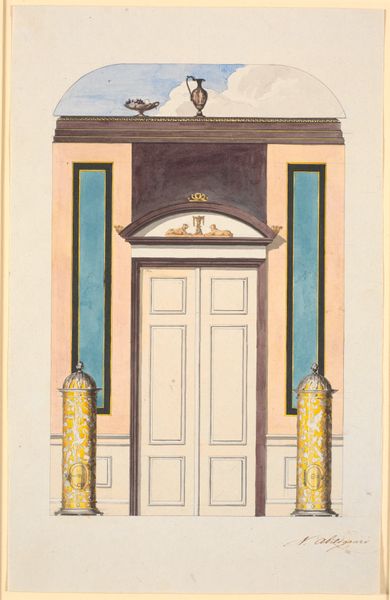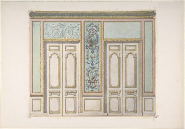 Editor: Here we have Jules-Edmond-Charles Lachaise's "Design for Wall Paneling, Deepdene, Dorking, Surrey," created between 1875 and 1879. It's a delicate drawing rendered in watercolor, boasting fine lines. I'm immediately struck by its rather restrained palette; it evokes a sense of stately home, but one almost yearning for spring. What stands out to you? Curator: Ah, yes, it’s that fascinating push and pull between formality and fancy. It's so much more than just a plan for pretty walls. You know, I sometimes think of these drawings as ghosts of rooms that never were. Lachaise’s design feels caught between eras. The strong lines hint at neoclassicism, don't they? A kind of return to order? But there is a whisper of the decorative arts movement fluttering throughout it as well. A bit like someone humming a stately sonata but humming it to a slightly different beat. Tell me, what is your eye drawn to? Editor: The little winged creature, it's so playful amid all the rigid geometry! I think without it, the paneling might feel quite austere. Curator: Exactly! It is the heart beating amidst a very controlled pulse, wouldn’t you agree? These designs let us glimpse a particular moment, one teetering on a shift from serious neoclassicism to something more… playful. More human, perhaps. It's about control, but there is freedom nestled inside it! What's our take away? Editor: I suppose it makes me reconsider decorative arts – they are just as valuable a window into cultural change as the "high arts.” Curator: Beautifully put! I am glad we looked at Lachaise’s lovely echo together today.