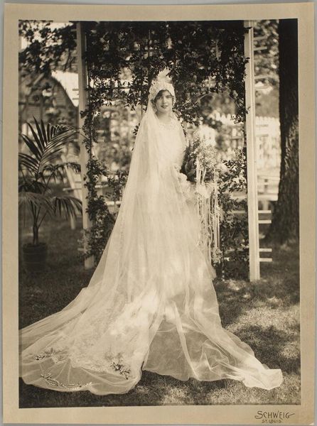 Editor: This gelatin silver print, simply called "Untitled (bridal portrait)," is by Martin Schweig. The bride seems caught between dreams and reality. How do you interpret this work, given its mysterious atmosphere? Curator: The bride floats in a liminal space, doesn't she? The portrait behind her echoes yet another version of herself, a ghost in the making. It feels like a transition, not just into marriage but into a different realm, maybe a bit melancholic? Editor: That's such an interesting point about the portrait behind her! It almost feels like two versions of herself, then and soon to be. Curator: Exactly! And the starkness, the silvery tones… it's a beautiful, haunting premonition. I wonder what her life was like, if she ever looked back at this picture. Editor: It really makes you think about the stories behind the image. Curator: Absolutely. It is a photo that captures a moment full of unspoken promises and anxieties.