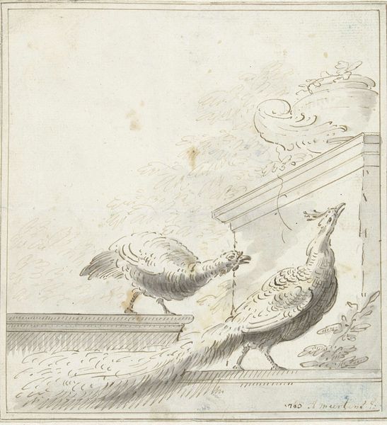 Curator: Harmen ter Borch’s “Drie kalkoenen,” or “Three Turkeys,” drawn in 1653, uses pen and ink to depict a humble barnyard scene. It is now located in the Rijksmuseum. Editor: At first glance, there's a strangely gentle humor to this pen sketch. They almost appear as caricatures, with an odd dignity, like slightly bewildered gentlemen. Curator: It’s interesting you use the term 'gentlemen' because these animals were becoming increasingly fashionable amongst the upper classes during this era. Consider where ter Borch situated himself and his artistic production. Was it just a barnyard scene? Editor: Maybe that reading’s a bit too romantic then! It's definitely not idealized. There is an honesty to how he renders them; it avoids sentimentality, showing just the subtle textures of their plumage and skin. I'm also drawn to that peculiar head peeking in from the upper left corner, like a half-formed thought. Curator: Consider the materials. Ter Borch isn't using expensive paints or canvases; he chooses pen and ink. What does this say about its status? Is this a study? A doodle? Or could it have served a greater social function as perhaps a guide for less skilled artists, perhaps something reproduced by Ter Borch or assistants from his studio for mass consumption, something practical, rather than an attempt to elevate art? Editor: I can see that perspective. And yet, even within its modest format, there is real artistry. The delicacy of the line work, especially, captures so much personality. Also, let's not disregard its lasting charm. Something about that rawness makes the drawing more appealing to me today. It invites intimacy rather than demanding reverence. Curator: That feeling of intimacy speaks to changing market forces and increasing globalized exchange. The increasing desire amongst merchant classes for smaller, intimate works to place within increasingly decorated domestic interiors. Think how rapidly goods from other lands traveled into Dutch ports, including these once-exotic birds, becoming integrated into the economy of daily life and the imagery created. Editor: So, while rooted in the specifics of its time, ter Borch’s sketch still feels accessible. It prompts questions, perhaps because it holds itself open to different readings. Curator: A reminder that what might appear as a simple, even throwaway image from the past reveals layers of a complex, material world when we really examine it.
