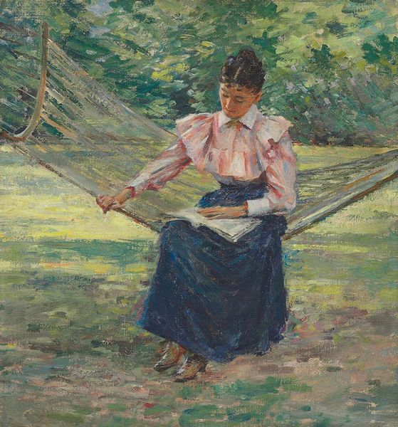 Theodore Robinson created the painting 'Correspondence', an impressionistic scene, though the exact date remains unknown. Robinson, an American artist, spent time in France, befriending Claude Monet and absorbing the aesthetics of Impressionism. This painting depicts a woman, likely middle-class, seated in a hammock, deeply absorbed in reading letters. The act of correspondence suggests a narrative of connection and communication, yet it also hints at the social constraints placed upon women of this era, whose lives were often confined to the domestic sphere. The soft brushstrokes and bright color palette evoke a sense of leisure and tranquility, but also the quiet introspection of a woman's world. Robinson captures a moment of quiet contemplation. Perhaps he aimed to portray not just a scene, but the emotional landscape of his sitter. Consider the interplay between the external beauty of the scene and the internal world of the woman engrossed in her letters. It reveals both the comforts and the confinements of her time.