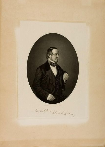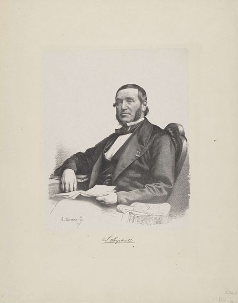 Curator: Here we have Adrianus Johannes Ehnle’s “Portret van H. Beeke” created in 1845. Editor: It’s very elegant, a study in careful restraint. The monochromatic palette lends it a serious, almost somber mood, fitting for a portrait of the era. Curator: The tonal qualities here speak to an interest in exploring graphite's inherent capabilities as a drawing tool and as a commercial form of early photographic reproduction. Looking at the paper itself, can you see the traces of its making? The laid lines suggest a certain kind of craft and perhaps the kind of mill used at the time? Editor: Absolutely. The paper’s texture itself plays a huge role, catching the graphite in subtle ways. You can almost feel the tooth of it. And yes, the paper is certainly indicative of 19th-century manufacturing practices and social context that framed the availability and expense of material at that time. Curator: Ehnle truly uses those tonal qualities to emphasize the character and mood, wouldn't you agree? The soft shading gives Beeke a certain approachable, pensive air. He holds a book—a common symbol of knowledge, wisdom, and perhaps even social status at the time. Its placement in his hand and the subject’s gaze draws our eye towards what is arguably his most valuable material object. Editor: That's a shrewd observation! The book isn’t merely a prop; it's an integral part of the portrait's narrative and what this piece is trying to sell us. The hand, however, feels awkward and rather unresolved. Curator: Indeed! The way Beeke's jacket drapes feels reminiscent of classical portraiture, suggesting education and standing—something lasting. While it uses simple materials, the subject reminds us of powerful and aspirational leaders and rulers. Editor: To really think about graphite in relation to commerce at the time truly provides so much insight in this piece of subtle ingenuity. Curator: Yes! In studying the composition as it has become its present appearance, the artist makes lasting and culturally memorable icons for all.