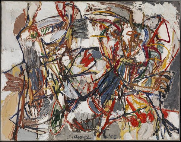 Curator: Here we have William Turnbull's "Head," an oil painting held in the Tate Collections. It’s a sizable canvas, over a meter tall. Quite striking, isn't it? Editor: It's… unsettled. Like a thought barely formed, a memory fragmented into these little blocks of color. I feel the chaos of consciousness, almost. Curator: The abstraction lends itself to that interpretation. Heads, in art, are often stand-ins for intellect or identity. Do you think Turnbull is hinting at a crisis of self? Editor: Or maybe it's the opposite? Building an identity out of all these colorful, disconnected experiences. Sort of beautiful, actually, like a stained-glass window. Curator: That's a lovely thought. The deliberate, almost mosaic-like application of paint does suggest construction, not destruction. Editor: Yes! It's less about the 'head' as a symbol and more about the process of becoming, of piecing oneself together. Gives you something to think about. Curator: It certainly does. Another layer to Turnbull's work that I hadn't considered.