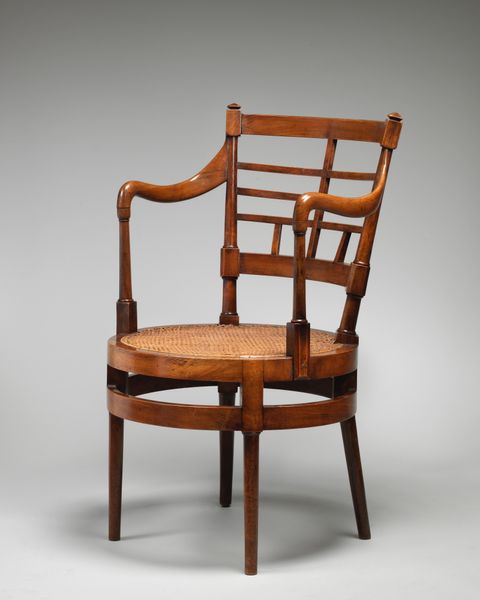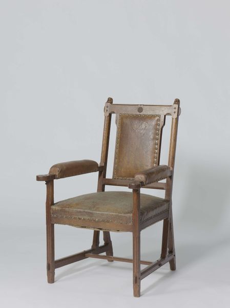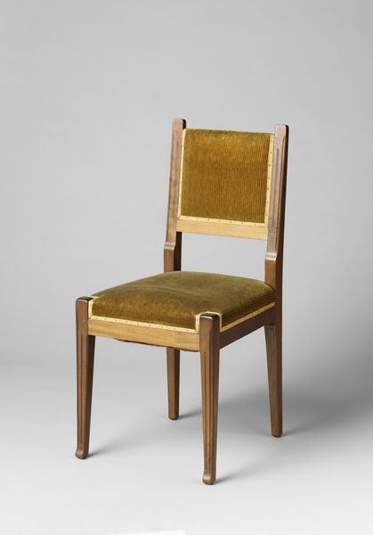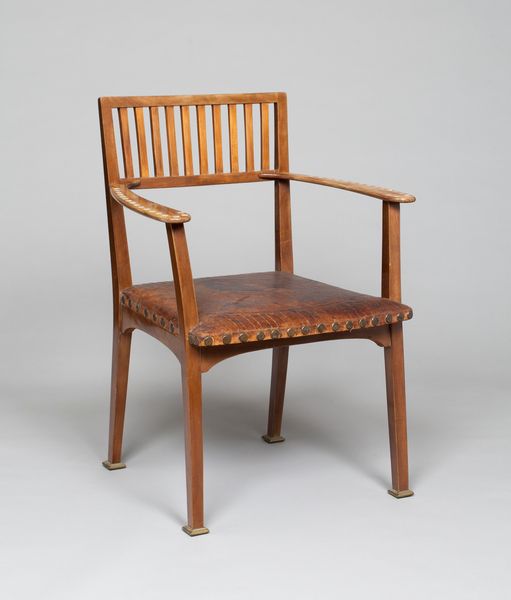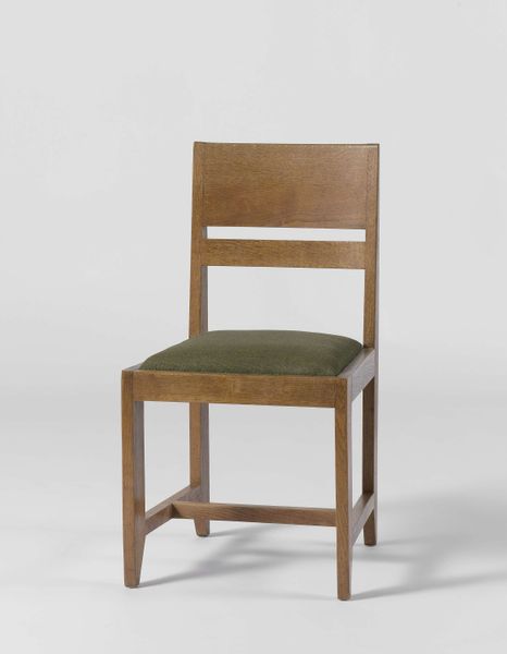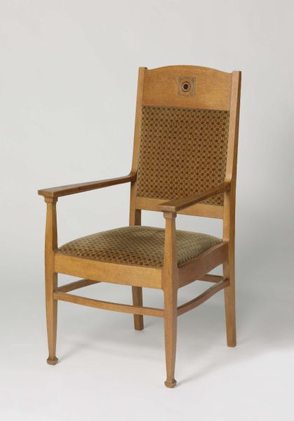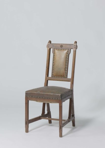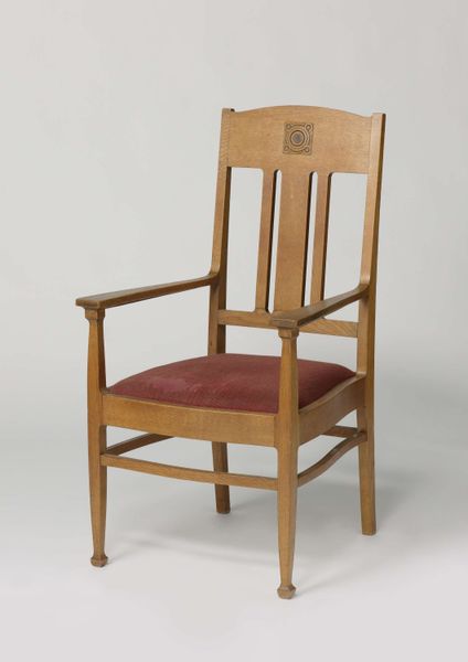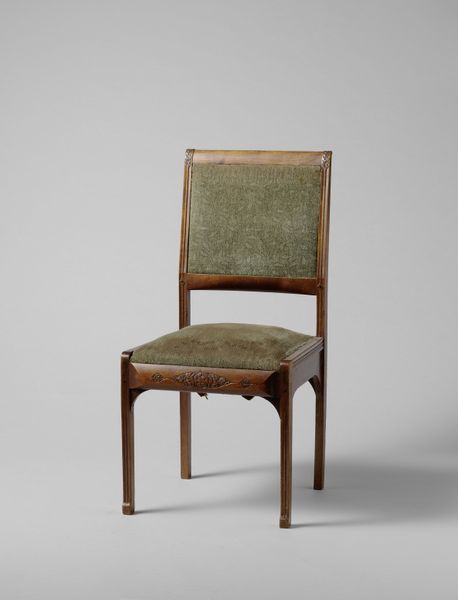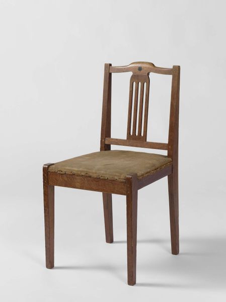Curator: Gerrit Willem Dijsselhof created this chair around 1900, now held in the Rijksmuseum. The piece is named "Stoel met klimopversiering in rugpaneel" or Chair with Ivy Decoration in Back Panel, made of wood. Editor: My first impression is quiet elegance. It possesses this understated confidence, with its muted tones and geometrical form giving off the feeling of solid, quality workmanship. Curator: Absolutely, you notice the careful geometric design—typical of the Arts and Crafts movement. Look closely at how Dijsselhof employs simple, functional forms without sacrificing decorative touches, as seen in the stylized ivy detailing at the top of the back panel. For him, material integrity was key. Editor: The ivy itself is an interesting choice. Ivy often symbolizes attachment, loyalty, and eternity. I wonder if Dijsselhof intended for this chair to evoke those values within a domestic space. The plant also implies growth and resilience, like the home itself. Curator: Intriguing thought. Thinking about its manufacture, we have to remember the Arts and Crafts movement prized handcrafted quality over mass-produced goods. Each element, carefully considered and skillfully executed, speaks to the labor and time involved in its creation. The chair is not just furniture; it embodies a commitment to artisanal practices. Editor: Right, and I can feel that tactile element even in the image. Its wooden form must be a sensory pleasure to behold in person. The seat cushion must enhance its inviting feeling. To me, it's a timeless emblem of domestic stability and nature's gentle persistence. Curator: Considering this was made during a period of industrialization and urban expansion, its homage to the natural world becomes even more meaningful as a reflection of society. This brings a whole new perspective on appreciating functional design. Editor: It's given me plenty to contemplate. It makes you question how even everyday objects can embody complex meanings and cultural values.
