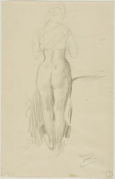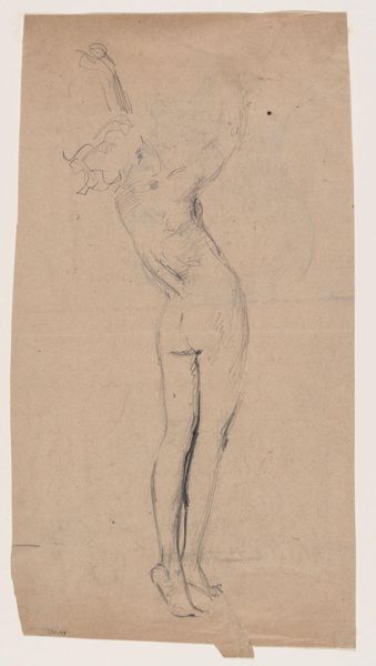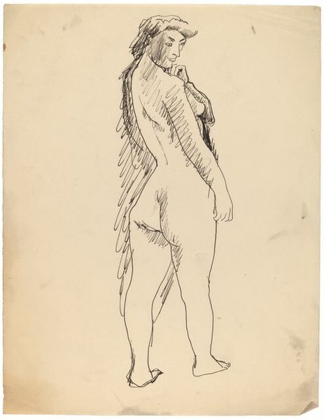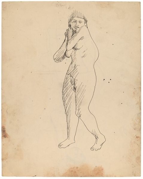 This drawing, titled "Standing Female Nude in Contraposto Stance with Hands Behind Head," was made by Mark Rothko using pen on paper. Rothko is best known for his large abstract expressionist paintings, fields of color that seem to float on the canvas. But here, we see him working in a more traditional mode, using line to define form. The paper itself is aged and stained, bearing witness to the passage of time. This contrasts with the quick, gestural lines of the pen, a dance between control and spontaneity. The technique Rothko employs here invites us to consider the art of drawing itself, a fundamental skill that underlies so much creative practice. It reminds us that even the most revolutionary artists are often deeply grounded in tradition. Think about the countless hours of practice, the labor of hand and eye coordination, that went into achieving this seemingly simple sketch. Ultimately, this drawing encourages us to look beyond Rothko's iconic paintings and appreciate the breadth of his artistic vision, recognizing the value of both process and product.