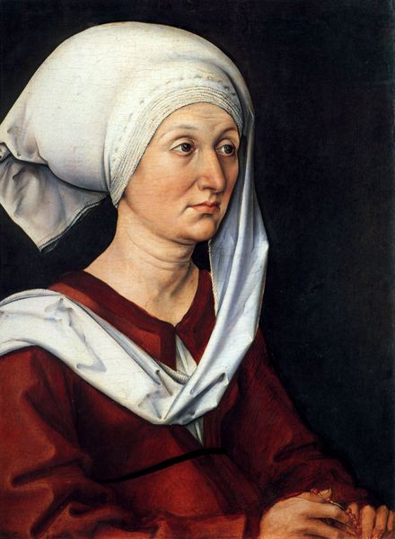 Curator: Before us hangs Albrecht Dürer's oil-on-panel portrait of Felicitas Tucher, painted in 1499. The painting finds its home today here at Schloss Weimar. Editor: My initial feeling is one of reserved elegance, tinged with a hint of melancholy. Her gaze is direct but distant, and the cool tones evoke a sense of stillness. Curator: Absolutely. It's vital to understand the context here: Felicitas was part of a prominent Nuremberg family. Portraiture in this era wasn't merely about representation but a demonstration of social standing and lineage. The inclusion of the landscape background situates her within a worldly domain, while the decorative patterning around the painting reinforces her high status. Editor: Precisely. Observe how the details work to establish an image, every element is carefully placed for maximum symbolical resonance. The flower, the landscape behind, they must communicate important parts of her character and biography. Is that a carnation she’s holding? That would symbolize marital love, tying in with familial expectations. And what about the landscape… perhaps echoing her familial estates or perhaps her spiritual journey. The visual language of Northern Renaissance art like this painting carries profound weight, imbuing this image of Felicitas with cultural layers for us to consider and investigate. Curator: I agree completely, it is important to contextualize that there's often an idealized element in portraits such as this one; Dürer was showcasing both Felicitas's likeness and crafting a symbol of her position in society. So what seems to be her authentic appearance would've been modulated to flatter or underscore her status. The soft landscape also acts as a reminder of her wealth as land owner in 15th century. Editor: A fascinating interplay of the personal and the presentational! Seeing Felicitas through Dürer's carefully constructed image—it's not just about a pretty picture, it's a window into the Renaissance self and what that could project for eternity! Curator: Indeed, examining this portrait deepens our understanding of the intersection between art, society, and the individuals who navigated its complexities. Editor: Seeing how those visual cues create something timeless that reaches beyond their intended moment is the enduring power of visual imagery.