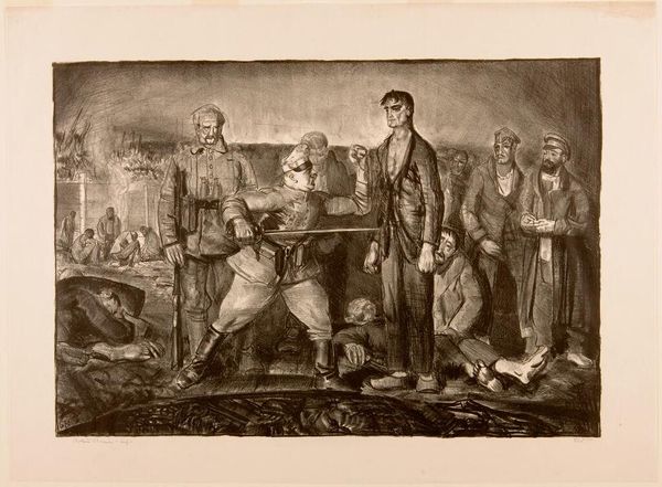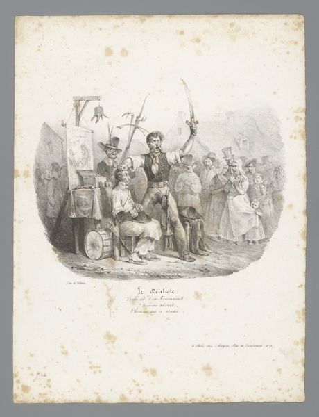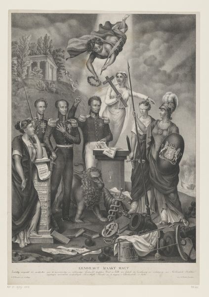 Curator: Eugéne Hippolyte Forest created this lithograph, "The Birth of the Juste Milieu," and it resides at the Harvard Art Museums. Editor: Oh, my! What a chaotic scene—it feels like a fever dream of revolution and bureaucracy, rendered in exquisitely detailed monochrome. Curator: "Juste Milieu" translates to "the happy medium" or "the golden mean," a political philosophy favoring moderation. The image critiques the birth of this idea after the 1830 revolution. Editor: So, the fainting woman is Liberty? And who is that man holding up the baby, giving it a rather rough start in life? Curator: That is a depiction of a political figure imposing the "Juste Milieu" on the newborn Liberty, forcing moderation. A rooster crows at the left, a symbol of France, perhaps questioning this constrained freedom. Editor: A rooster's crow of doubt... I love that! There's so much going on; it’s a brilliant, biting commentary, even now. Curator: Indeed, the symbolism captures the complexities and contradictions inherent in trying to find that "middle ground." Editor: It’s fascinating how relevant this feels. It’s a good reminder to question what's really going on when someone says they’re offering the "moderate" solution.