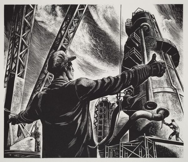Lynd Kendall Ward’s print, Untitled (Delivery By Rail), employs the stark contrast of black and white to construct a narrative of industry and labor, a powerful demonstration of the printmaker’s process. The eye is immediately drawn to the figure of the worker, his hand raised, perhaps in a signal, rendered with a precision that speaks to the artist's mastery of the medium. Look closely, and you’ll see how the texture is built through meticulous carving, the surface alive with the energy of Ward’s hand. I’m struck by the way the light emanates from the horizon, almost blinding in its intensity. It contrasts with the deep shadows that define the machinery and landscape. Ward’s work has this graphic punch that reminds me of some German Expressionist woodcuts, a shared intensity, but with a distinctly American flavor. Ultimately, this print invites us to consider the human element within the grand machinery of industry, a conversation that continues to resonate today.