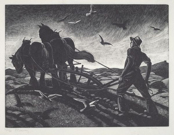 Curator: Lambing, a print created by Clare Leighton in 1932, offers a glimpse into rural life. It immediately strikes me as quite industrious. The black and white is beautifully detailed with light and dark shadows adding clarity. What are your initial thoughts? Editor: It evokes a stark, almost documentary feel. I’m immediately drawn to the texture created by the medium itself. You can almost feel the roughness of the wool and the earthiness of the farmyard. I would guess the material is wood, which would add to the effect and align with the working classes depiction in the piece. Curator: Precisely! Leighton was deeply engaged with depictions of labor, and wood engraving, as a medium, allowed for the wide dissemination of images to a mass audience during this period. Prints were far more accessible, bringing art to the public sphere, reflecting her social ideals. The act of labor itself, the process of creating these pastoral images, becomes central. Editor: Absolutely. And if we think about the social context, the 1930s, during a period of economic depression… this image can be viewed as an idealization of rural life. It is showing a world removed from the harsh realities that were taking place within those decades. It presents a nostalgic view of pastoral England at that time, even perhaps offering a sense of hope. Curator: Yes, but there is also something more complex at play. Notice the emphasis on the hand-worked nature of the print itself and then compare it with the way lambing is presented as an ongoing endeavor, which can also be argued as an important social context consideration, given it shows how the means of agricultural production was developing during this time. It celebrates the workers and animals that contribute to our environment, as a reminder of simpler times. Editor: I concur that it is a nostalgic perspective, that could potentially challenge the societal shifts of the time, with urbanization rapidly increasing at the time. And a question comes to mind; What were Leighton's feelings for London when producing this? Curator: Ultimately, this print invites us to consider not only the depicted scene, but also the labor involved in both the subject of the work and the material means of production itself and encourages us to be aware of its social context, when it was created and consumed. Editor: And how institutions and social commentary shaped, and continues to shape, how we receive this scene from rural England.