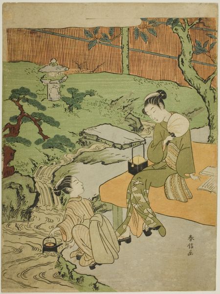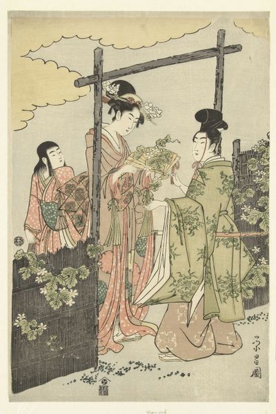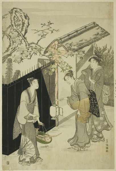 Editor: This gorgeous print, *Viewing Cherry Blossoms at Goten Hill*, dates back to about 1787 and is by Chōbunsai Eishi. The composition, with the figures placed against the backdrop of a festival, is really striking. What stands out to you in this Ukiyo-e print? Curator: What captivates me is the tangible tension between refined aesthetics and everyday life rendered through material processes. Notice the flattened perspective and bold outlines, conventions made possible by woodblock printing. How does the material accessibility of the print – consider its potential for mass production and consumption – shape its significance? Editor: That's an interesting point. It does feel like it's meant to be widely distributed and enjoyed. So, are you suggesting the act of printing, the choice of inexpensive materials like woodblocks and paper, democratized the art form? Curator: Precisely. And that’s vital to understanding the culture surrounding *ukiyo-e*. By examining the production process and the accessible materials, the social dynamics are foregrounded, challenging notions of rarefied “high art." The elaborate hairstyles and kimonos speak to status and consumption; consider the laborers needed to produce the textiles. The artist embeds commentary within scenes of leisure, offering glimpses into social strata. Editor: That makes me consider the role of the publisher, too. Didn't they have workshops and employ artisans? Curator: Absolutely! The publisher acts as a crucial, almost invisible, force shaping not just aesthetics, but consumer trends. So much more than just artist vision. The means of production here really complicates any single genius narrative, doesn't it? Editor: Definitely. Seeing it as a manufactured item for widespread consumption and distribution offers a richer way to understand this type of artwork, compared to the classic fine art perspective. Curator: Agreed. We can investigate how this art form was not just reflecting society, but actively participating in shaping consumer desire and social hierarchies.