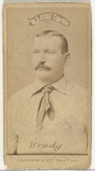 This is a portrait of an unknown man, created by France with a height of 105 mm and a width of 64 mm. The photograph presents a study in subtle contrasts and structured form. Notice the subject's striped suit, juxtaposed against the solid bow tie, creating a visual rhythm. The composition, closely cropped, draws us into the face, with its strong mustache serving as a focal point. Consider how the sepia tone flattens the depth, emphasizing the surface and materiality of the print itself. This technique anticipates modernist concerns with the artwork as an object, rather than a mere representation. It challenges fixed meanings and engages with new ways of thinking about space and perception. The linear pattern of the suit directs our gaze upwards, highlighting the formal structure of the portrait and its engagement with the semiotic system of signs and cultural codes. This photograph prompts questions about representation, identity, and the very nature of seeing, reminding us that art is a site of ongoing interpretation.
